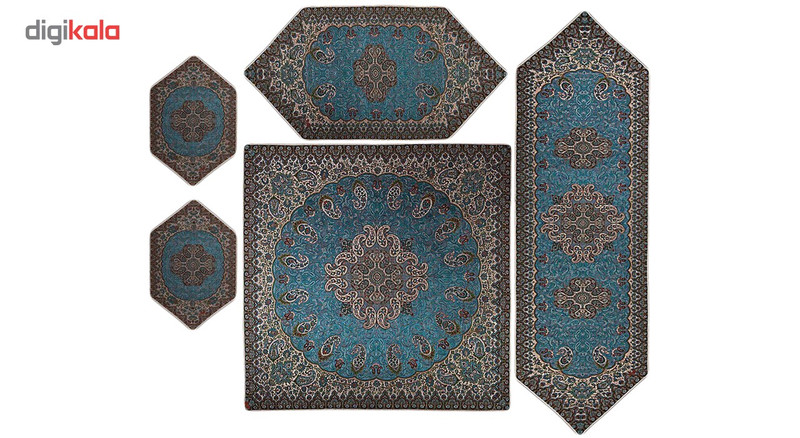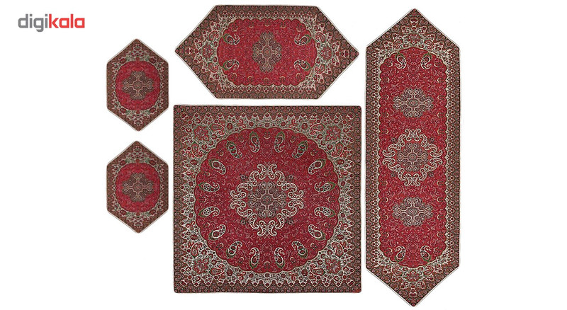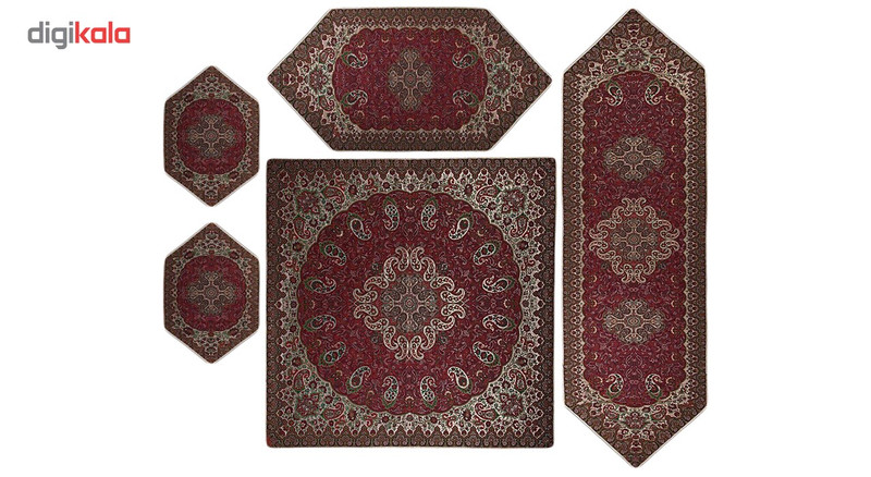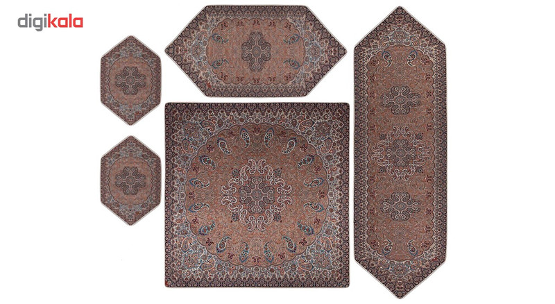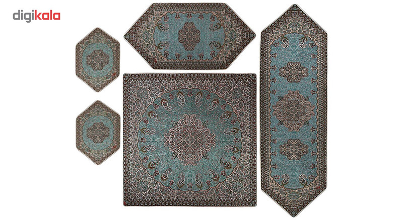سایر توضیحات- دوردوزی شده با نخ طلایی - رومیزی ترمه 5 تکه با سایزهای متفاوت - آستردوزی شده با یراق طلایی - تراکم 180