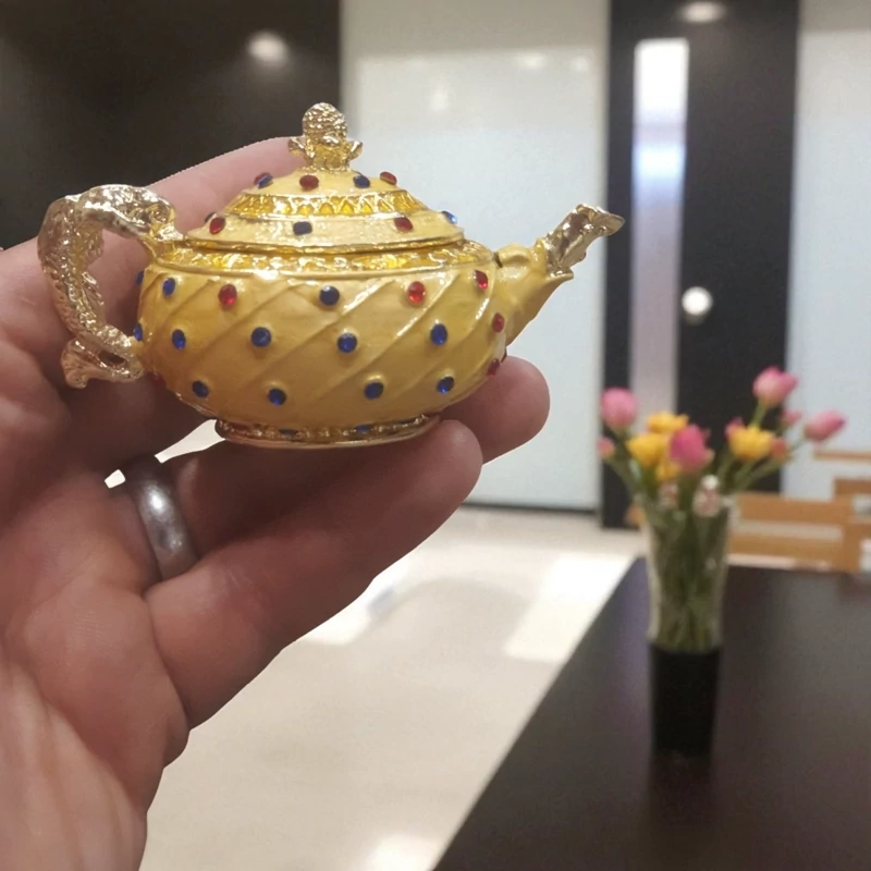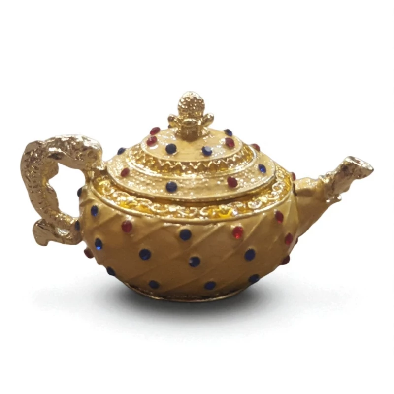 جاجواهری قوری فلزی، ترکیبی از کاربردی بودن و زیبایی دکور است. این قوری با رنگ کرم و نگینهای آبی و قرمز تزئین شده و جلوهای شیک و چشمنواز به میز، ویترین یا اتاق شما میبخشد.
