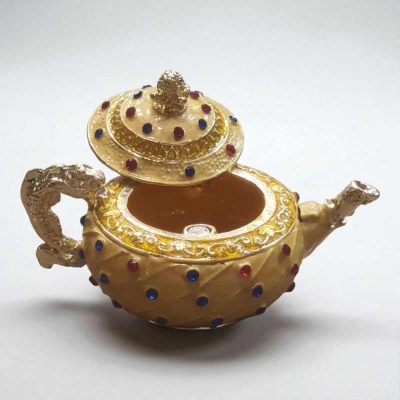 جاجواهری قوری فلزی، ترکیبی از کاربردی بودن و زیبایی دکور است. این قوری با رنگ کرم و نگینهای آبی و قرمز تزئین شده و جلوهای شیک و چشمنواز به میز، ویترین یا اتاق شما میبخشد.