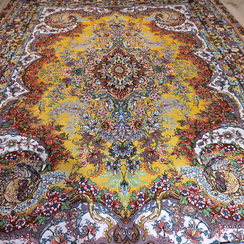 استفاده شده از رنگ های سنتی بارنگ طبیعی با کیفیت بسیار اعلا و رنگ ثابت چله و گل ابریشم کف غرق در ابریشم