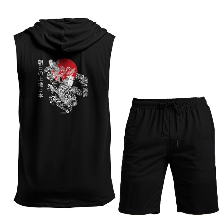 ست ورزشی مردانه نخی تاپ کلاه دار شلوارک رنگ مشکی b14021207E