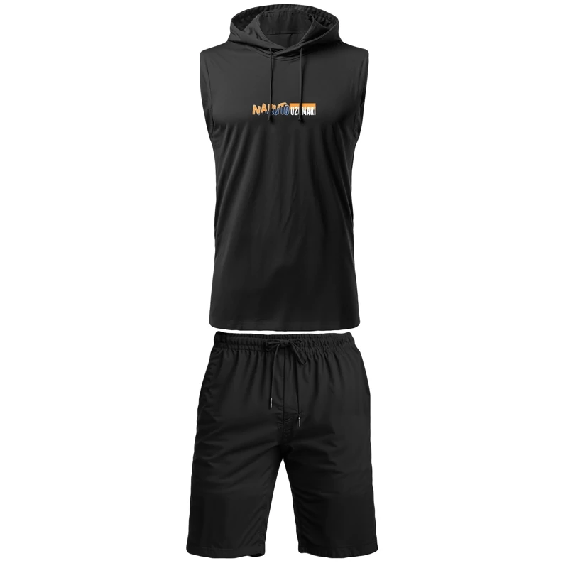 ست ورزشی مردانه نخی تاپ کلاه دار شلوارک رنگ مشکی 14030115a