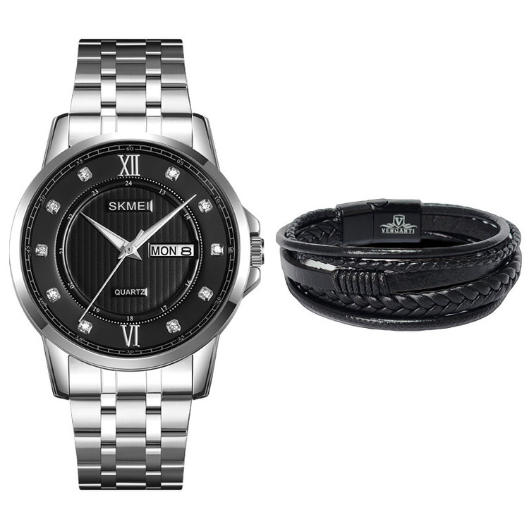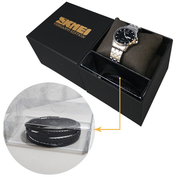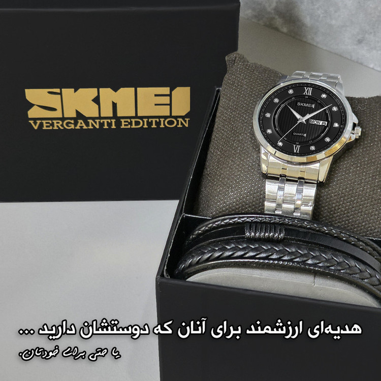 این مجموعه شامل ساعت مدل 2084 اسکمی با بند سیلیکا ژل، قابلیتهایی مثل نمایش دو زمانه، کرونومتر، زنگ هشدار، تقویم و نور EL، و دستبند چرمی مشکی ورگانتی با طراحی چندلایه و مهرههای جذاب است که استایل و راحتی را به شما هدیه میدهد.