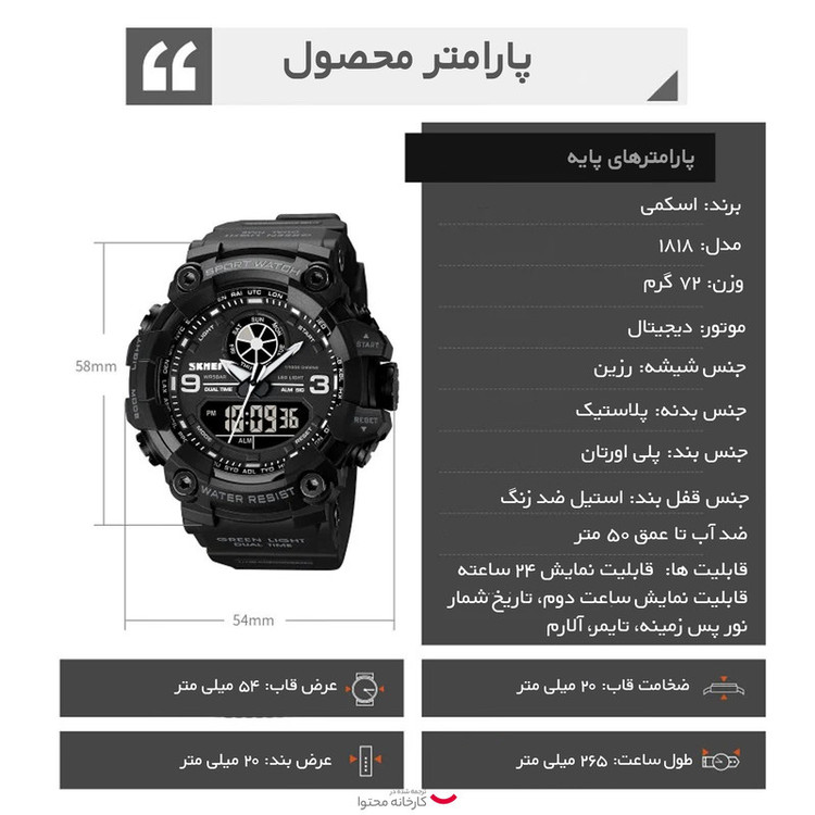 این روزها دیگر همه به تاثیر ساعت بر تیپ و استایل آگاهی کامل دارند. کمتر کسی پیدا می شود که تصور کند یک ساعت فقط کالایی برای نشان دادن زمان است.هر چه جلوتر می رویم جای خالی این محصول لوکس و زیبا را روی مچ خیلی از افراد مشاهده می کنیم. زیرا این روزها صنعت مد و فشن رابطه مستقیمی با استفاده از این اکسسوری جذاب دارد.شاید به نظر شما آنقدری که میگویند خرید یک ساعت شیک و استفاده از آن اهمیت نداشته باشد، اما بد نیست بدانید که اگر در انتخاب خود دقت کرده باشید و متناسب با آن پوشش مناسب را انتخاب کنید، آن ساعت مچی شگفت انگیز می تواند غوغایی در ظاهر شما بپا کند. شاید در نگاه نخست این زیبایی و جذابیت خیلی محسوس نباشد، اما یقینا تاثیرش را بر ناخودآگاه بینندگان خواهد گذاشت. ساعت های مچی به عنوان یک همراه همیشگی مناسب هر مکانی هستند. باشگاه ورزشی، استخر شنا، مسافرت، محل کار، قرار های دوستانه و عاشقانه و در کل برای استفاده روزمره مناسب هستند. شرکت اسکمی با ارائه مدل های مختلف اینبار ساعتی فوق العاده جذاب با تنوع رنگی چشم نواز را به تولید رسانده است.در این مدل به دلیل طراحی و رنگ بندی جذاب که در آن بکار رفته است حس خوشایندی را به شما و طرف مقابل القا میکند.از قابلیت های این ساعت میتوان به ضد آب تا عمق 50 متر , کرنومتر , شمارش معکوس , آلارم , نمایش 12/24 ساعته , نمایش همزمان دو زمان مختلف , چراغ صفحه , تقویم .... اشاره کرد.