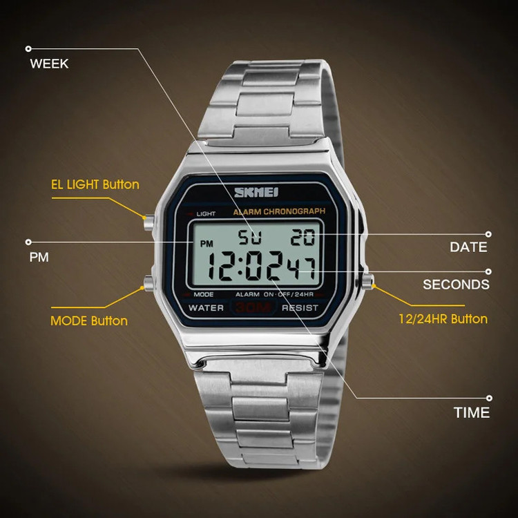 نمایش 24 ساعته , نور پس زمینه , تاریخ شمار , آلارم , ضد آب , تایمر