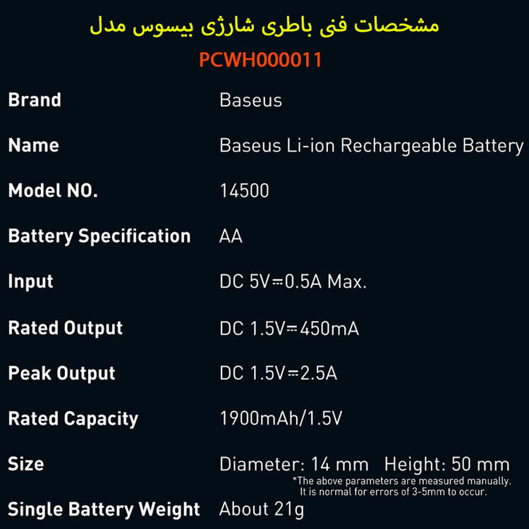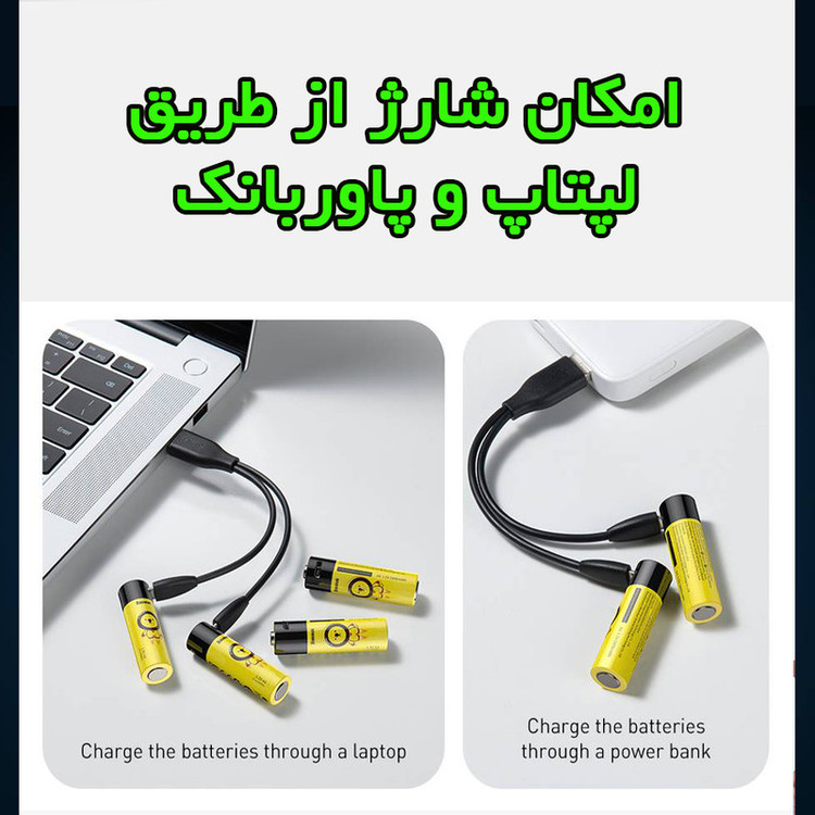 باتریهای قلمی میتوانند وسایل زیادی را بهکار بیندازند، اما عمر و ظرفیت محدودشان نکتهای منفیست که ما را مجبور به خرید چندبارهی آنها درطول سال میکند. به همین دلیل کمپانی بیسوس PCWH000011 را عرضه کرده که شامل دو باتری AA استاندارد 1.5 ولت است. برروی هرکدام از این باتریها پورتی از نوع microUSB وجود دارد که شارژ مجدد آنها را تا بیش از 1000 بار ممکن میسازد!هرکدام از این باتریهای 1900 میلیآمپرساعتی، حدود 21 گرم وزن دارند و قطر و ارتفاع آنها نیز بهترتیب 14 و 50 میلیمتر است. از اینها گذشته، این باتریها از نوع لیتیوم-یونی هستند که قابلشارژ بودن آنها نیز به همین دلیل است؛ بهعلاوه این نوع باتریها بهطور معمول از طولعمر بالایی برخوردارند.