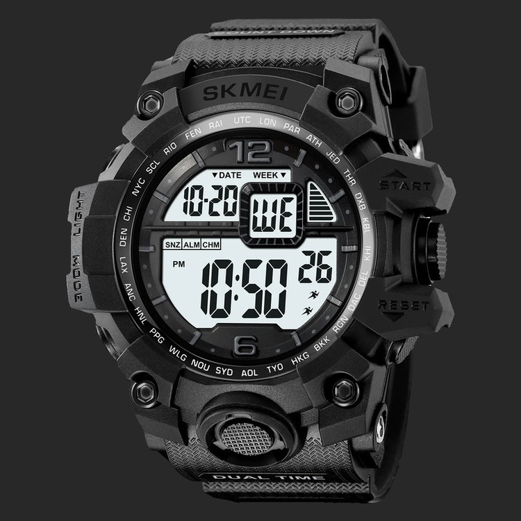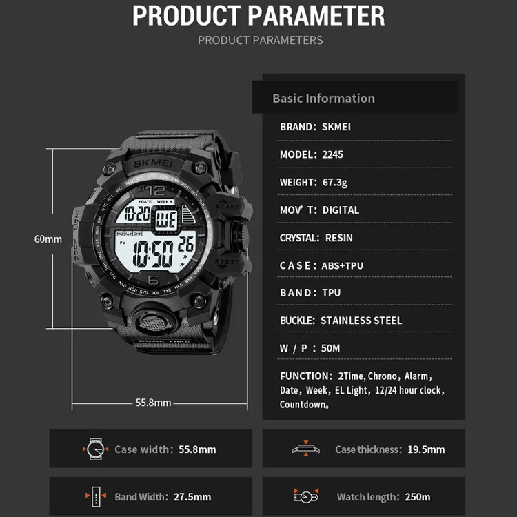 نمایش 24 ساعته , نمایش ساعت دوم , تاریخ شمار , نور پس زمینه , تایمر , آلارم