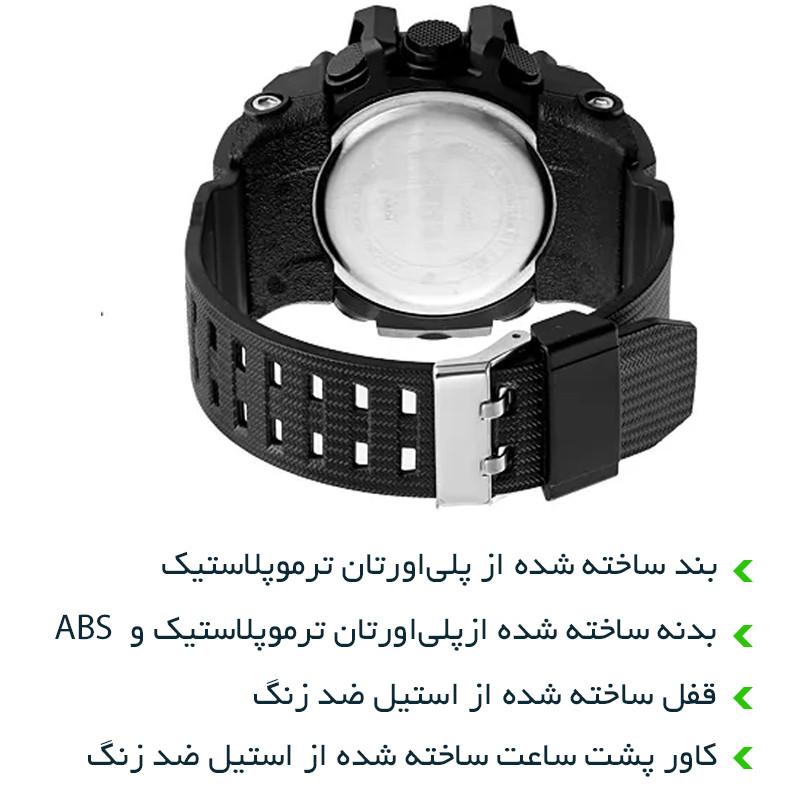 نمایش 24 ساعته , نمایش ساعت دوم , تاریخ شمار , نور پس زمینه , تایمر , آلارم