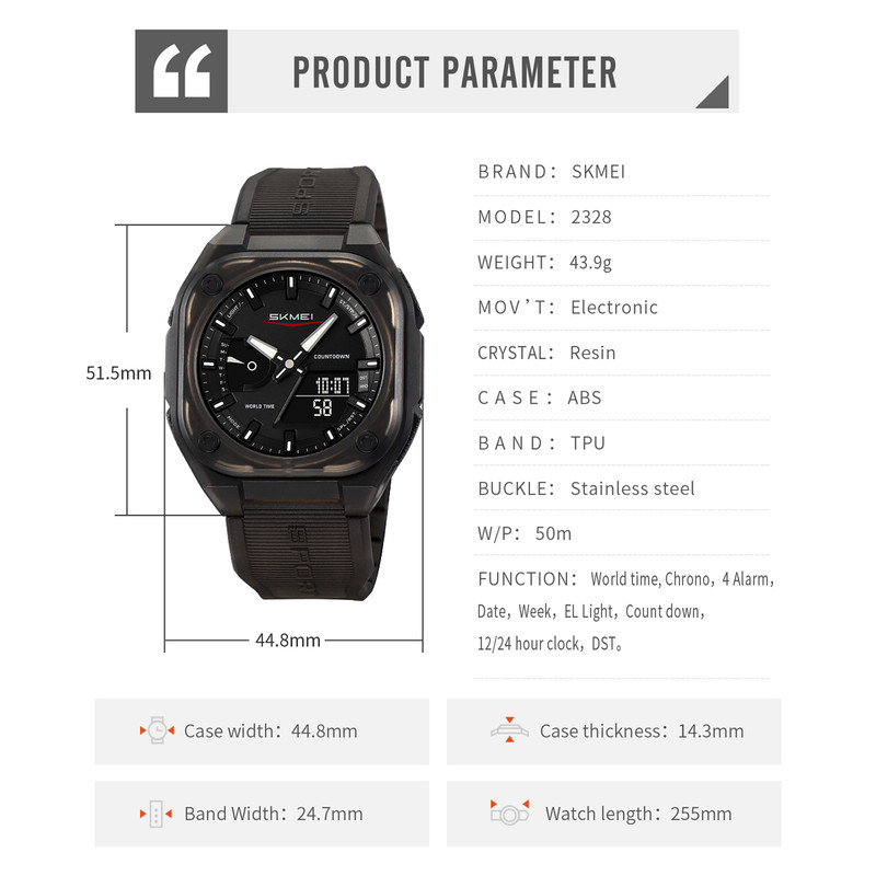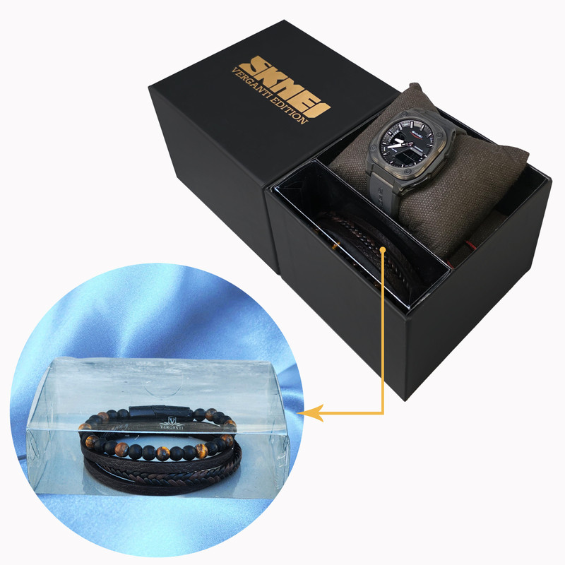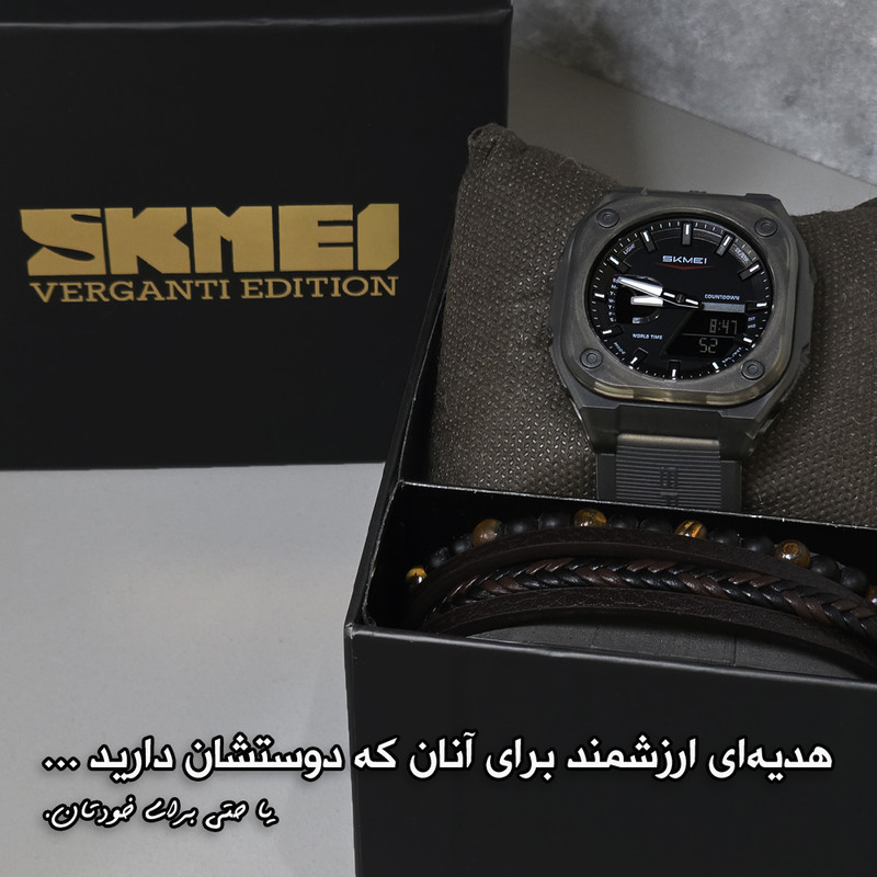 مشاهده محصولات مرتبطاین مجموعهی بینظیر از ساعت مدل 2328 اسکمی و دستبند چرمی قهوهای مشکی ورگانتی، انتخابی استثنایی برای شماست که به دنبال ترکیب استایل و عملکرد هستید! ساعت اسکمی با بدنه ABS و بند TPU مشکی، وزن سبک 43.9 گرمی و کریستال رزین، طراحی اسپرت و مقاومی ارائه میدهد. این ساعت با ابعاد 44.8 میلیمتر (عرض)، 14.3 میلیمتر (ضخامت) و طول 255 میلیمتر، قابلیتهایی مثل نمایش زمان جهانی، کرونومتر برای زمانسنجی دقیق، 4 زنگ هشدار برای یادآوری، تقویم با نمایش روز و تاریخ، نور EL برای دید در شب، شمارش معکوس برای مدیریت زمان، ساعت 12/24 ساعته، و تنظیم DST دارد—برای مثال، زمان جهانی برای سفرها مفید است، کرونومتر برای ورزشکاران عالی است، زنگ هشدار به برنامهریزی کمک میکند، و نور EL در تاریکی کاربرد دارد. با مقاومت آب تا 50 متر، این ساعت برای فعالیتهای روزمره و ورزشی ایدهآل است. اما نقطهی عطف این مجموعه، دستبند چرمی ورگانتی است؛ با چرم قهوهای مشکی باکیفیت، بافت چندلایه و مهرههای جذاب، استایلی شیک و منحصربهفرد به دست شما میبخشد و با نرمی و انعطافپذیریاش، راحتی بینظیری در استفاده طولانیمدت فراهم میکند، چه در روزمره و چه در موقعیتهای خاص، جلوهای خاص به استایل شما اضافه میکند.