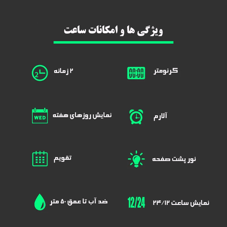 مشاهده محصولات مرتبطاین روزها دیگر همه به تاثیر ساعت بر تیپ و استایل آگاهی کامل دارند. کمتر کسی پیدا می شود که تصور کند یک ساعت فقط کالایی برای نشان دادن زمان است.هر چه جلوتر می رویم جای خالی این محصول لوکس و زیبا را روی مچ خیلی از افراد مشاهده می کنیم. زیرا این روزها صنعت مد و فشن رابطه مستقیمی با استفاده از این اکسسوری جذاب دارد.شاید به نظر شما آنقدری که میگویند خرید یک ساعت شیک و استفاده از آن اهمیت نداشته باشد، اما بد نیست بدانید که اگر در انتخاب خود دقت کرده باشید و متناسب با آن پوشش مناسب را انتخاب کنید، آن ساعت مچی شگفت انگیز می تواند غوغایی در ظاهر شما بپا کند. شاید در نگاه نخست این زیبایی و جذابیت خیلی محسوس نباشد، اما یقینا تاثیرش را بر ناخودآگاه بینندگان خواهد گذاشت. ساعت های مچی به عنوان یک همراه همیشگی مناسب هر مکانی هستند. باشگاه ورزشی، استخر شنا، مسافرت، محل کار، قرار های دوستانه و عاشقانه و در کل برای استفاده روزمره مناسب هستند. شرکت اسکمی با ارائه مدل های مختلف اینبار ساعتی فوق العاده جذاب با تنوع رنگی چشم نواز را به تولید رسانده است.در این مدل به دلیل طراحی و رنگ بندی جذاب که در آن بکار رفته است حس خوشایندی را به شما و طرف مقابل القا میکند.از قابلیت های این ساعت میتوان به ضد آب تا عمق ۵۰ متر , کرنومتر , شمارش معکوس , آلارم , نمایش 12/24 ساعته , نمایش همزمان دو زمان مختلف , چراغ صفحه , تقویم .... اشاره کرد.