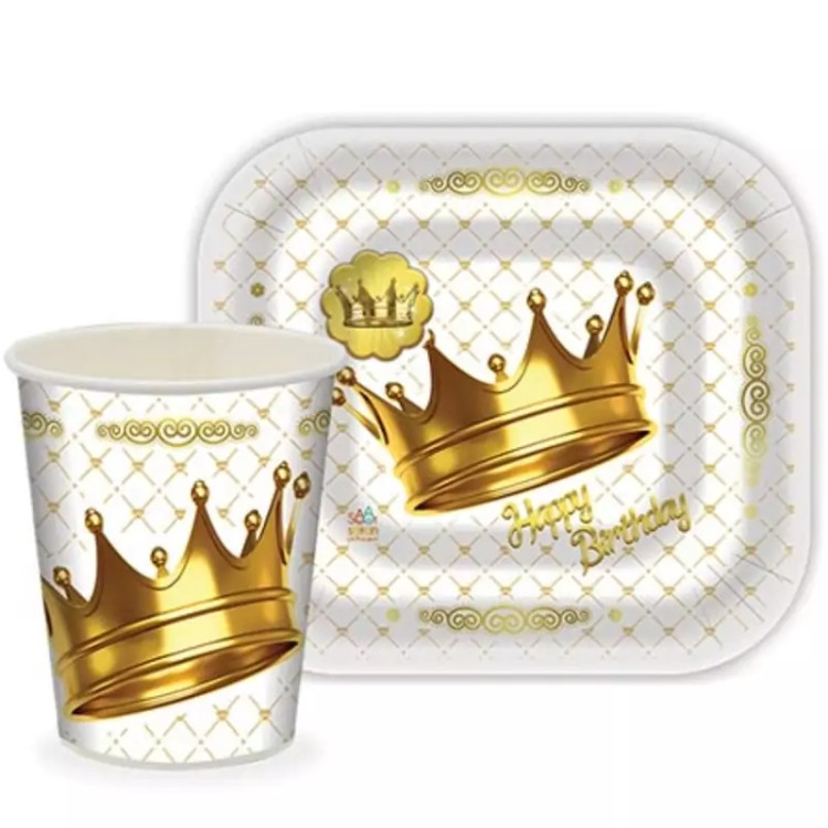 پیش دستی و لیوان 12 عددی تم تولد تاج طلایی سفید