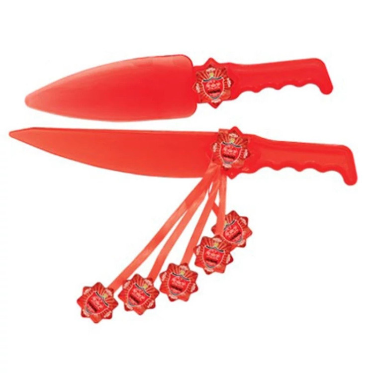 کارد و کفگیر کیک تم پرسپولیس (First Tooth Party) از جنس پلی استایرین (کریستال) تهیه شده از مواد درجه یک بهداشتی است که ابعاد کارد کیک بری 27 و کفگیر آن 25 سانتی متر می باشد، کارد کیک بری توسط ربان های صورتی که در سر آنها لیبل مربوط به تم جشن دندونی متصل است، به زیبایی تزیین شده که جهت برش و سرو کیک جشن و کفگیر، برای برداشتن آسان تکه های کیک مورد استفاده قرار می گیرد.