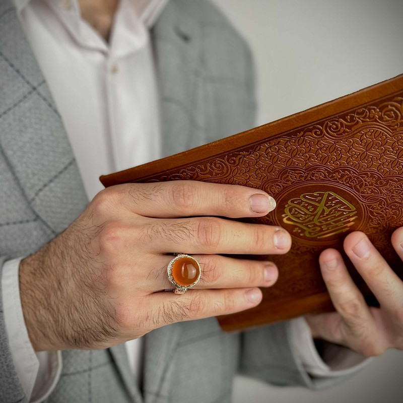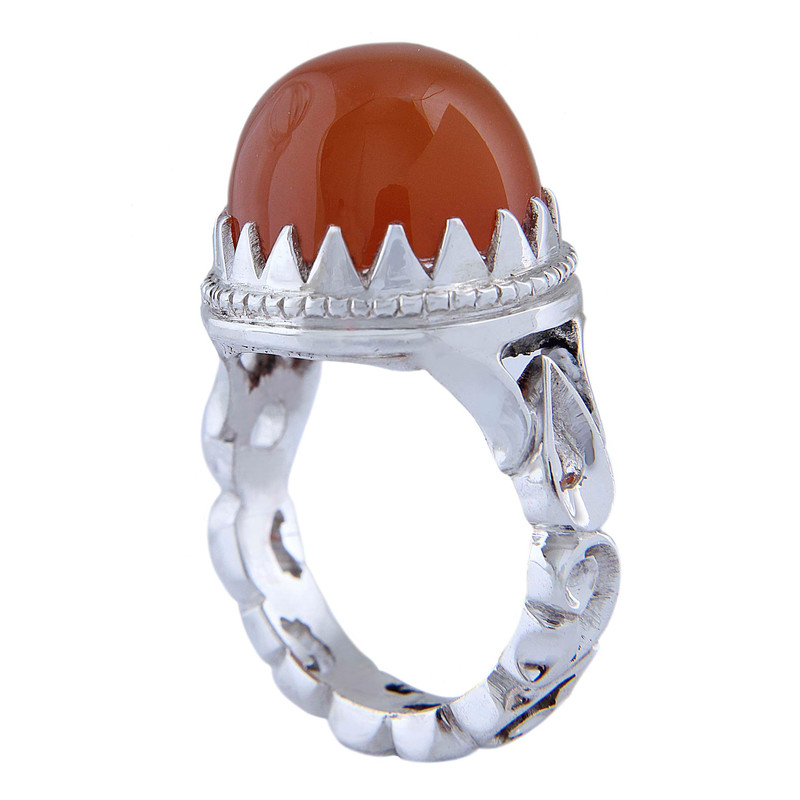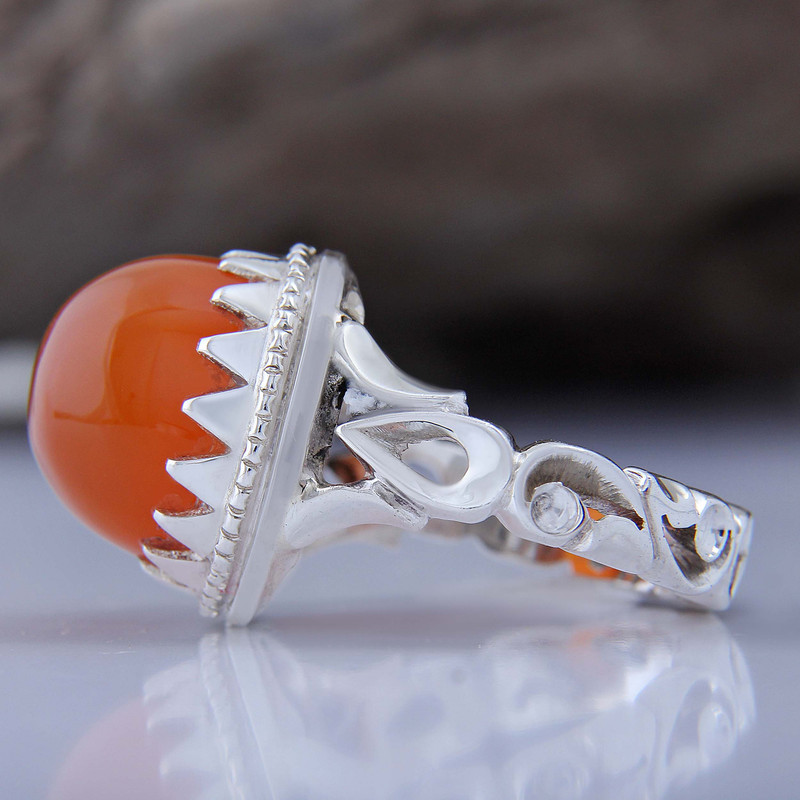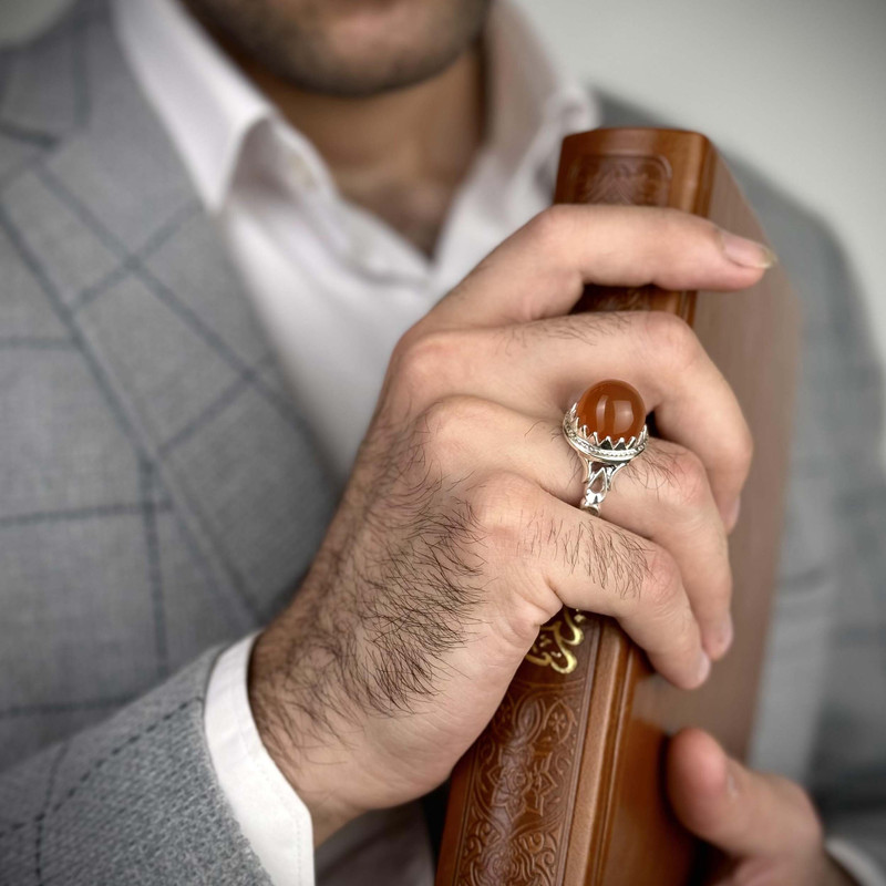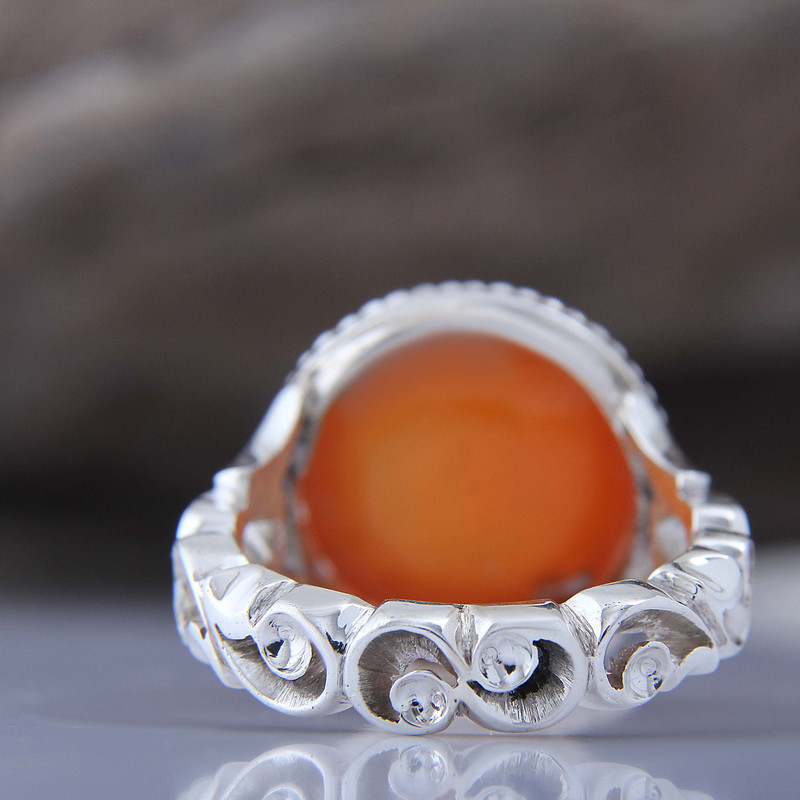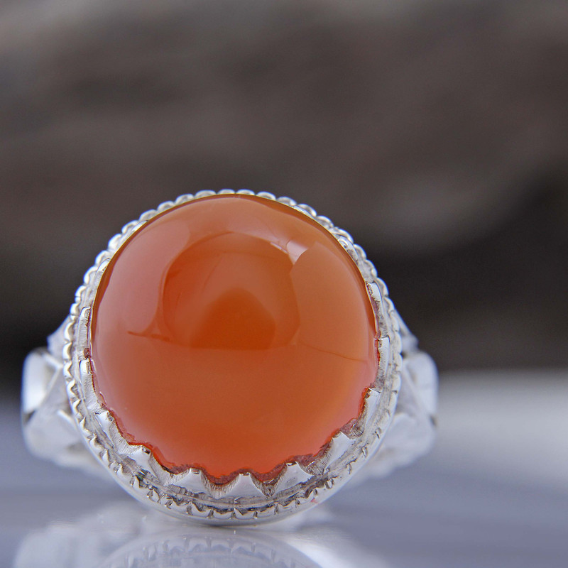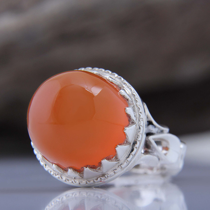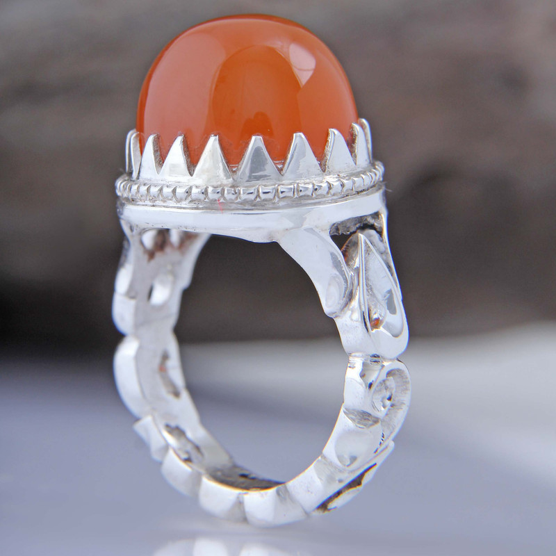 اگر دنبال خرید انگشتر نقره هستید این انگشتر نقره با رکاب اره کاری بسیار زیبا دستساز نقره عیار بالا عقیق یمنی پرتقالی تراش دامله که با دقت و ظرافت بالایی ساخته شده است گزینه مناسبی برای عاشقان انگشتر میباشد سنگ عقیق از دیرباز مورد توجه همگان بوده و هست و احادیث زیادی در مورد استفاده این سنگ وجود دارد. و به خاطر خواص معنوی ای که دارد از پراستفاده ترین سنگها در بین مردم میباشد. همچنین قبایل و ملل کهن جهان عقیق را سنگ مقدسی می دانسته اند و آن را از خود دور نمی کرده اند عقیق سنگی است که آن را حرز و حامی انسان در مقابل بلایا و حوادث به ویژه در جنگ ها می شمارند
