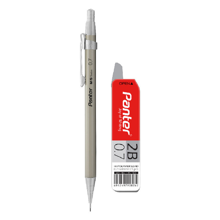 سایر توضیحاتمداد نوکی پنتر مدل Metal Jacket در رنگ های زغالی، نقرهای، بژ به همراه یک بسته نوک در بسته بندی آویزدار می باشد