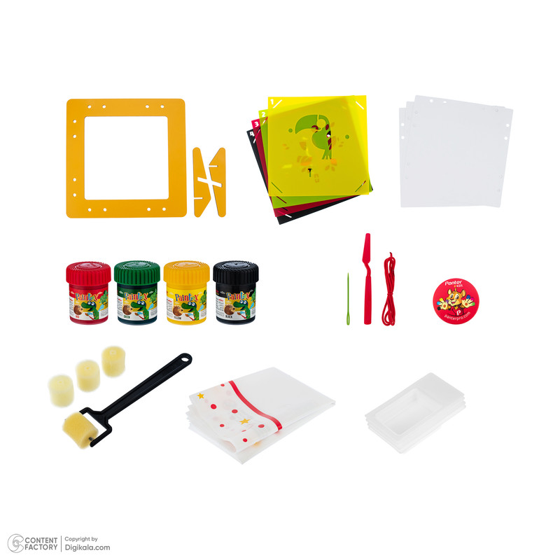 کارگاه چاپ پنتر; با برخورداری از لوازم مناسب و موردنیاز، فرزندان ما را با مراحل خلق یک محصول با استفاده از تکنیک چاپ شابلونی آشنا میکند. این محصول دارای 4 عدد نانوپوشرنگ گواش پنتر یا پوستر کالر در کیسه پلنگی، 4 عدد پالت رنگ، غلتک رنگآمیزی با اسفنج قابلتعویض برای رنگآمیزی رولی بر روی شابلون، 3 عدد صفحه مقوایی، 4 عدد شابلون پلیمری، کاردک پلاستیکی، قاب چوبی و پایه رنگی، نخ ماکارونی، سوزن پلاستیکی، یک عدد سفره بازی در سایز 100×70 سانتیمتر و دفترچه راهنما میباشد. گواشهای هنری پنتر مبتنی بر نانوتکنولوژی و با افزایش مقاومت در برابر سایش و خراشیدگی ساخته شدهاند که این ویژگی میتواند ماندگاری اثر هنری کودکان عزیزمان را افزایش دهد.