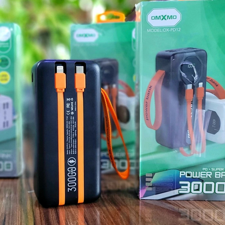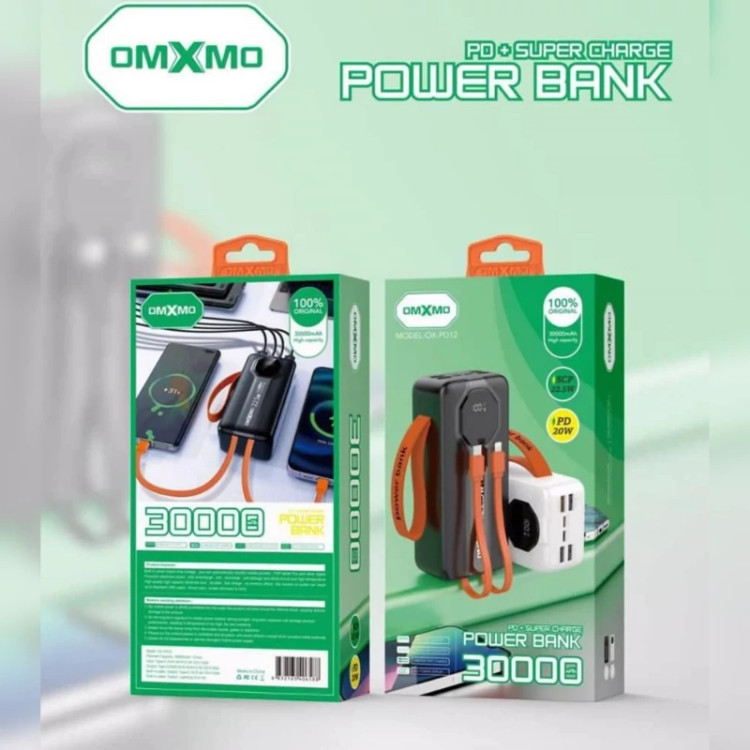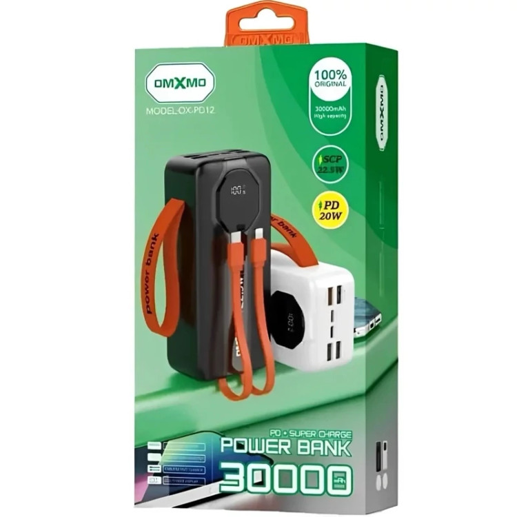 پاوربانک غول 30000 هزار اصلی 22/5W OMXMO سوپر فست 8 خروجی 4.8 امپر کمپینگ شرکتی کابل سر خود