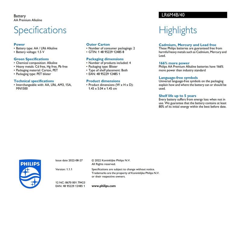 باتری قلمی فیلیپس مدل پریمیوم آلکالاین بسته چهار عدد
