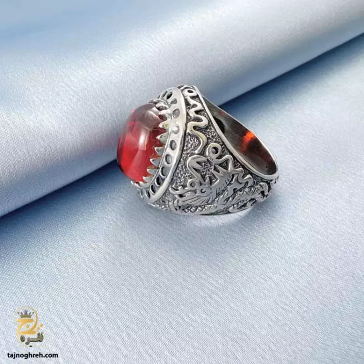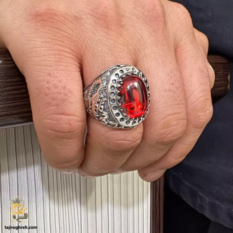 سنگ لعل قرمز با شکل بیضی و سطح صیقلی که در مرکز انگشتر قرار گرفته، جلوه ای پر ابهت و جذاب ایجاد کرده است.