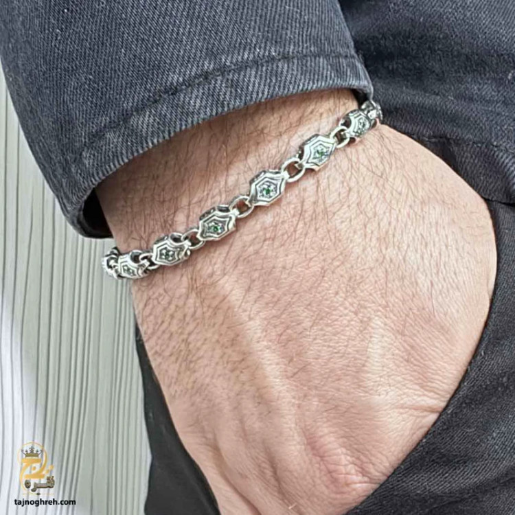 استفاده از نگین های درخشان زیرکونیا با طرح زمرد و یاقوت کبود، زیبایی و جلوه ای خاص به این دستبند بخشیده است.