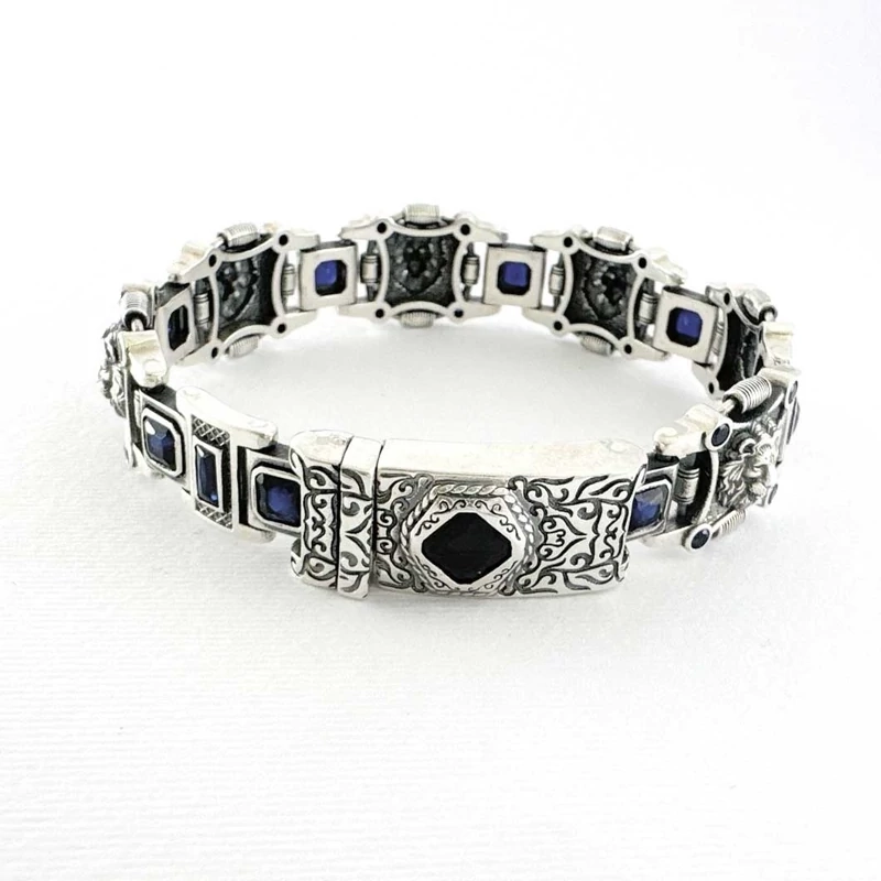نگین های آبی رنگ به کار رفته در این دستبند، از نوع زیر کونیا طرح یاقوت کبود باکیفیت بالا ساخته شده که با برش مربعی خود جلوه ای لوکس به دستبند بخشیده است.