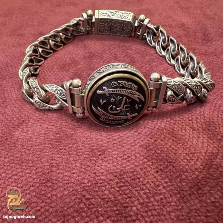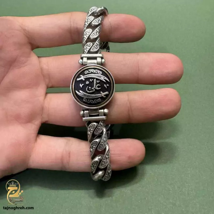 دستبند نقره مردانه طرح دار حضرت علی مدل BSM B4 یک اثر هنری خاص و جذاب است که با دقت و ظرافت بالا توسط جواهرسازان تایلندی ساخته شده است.