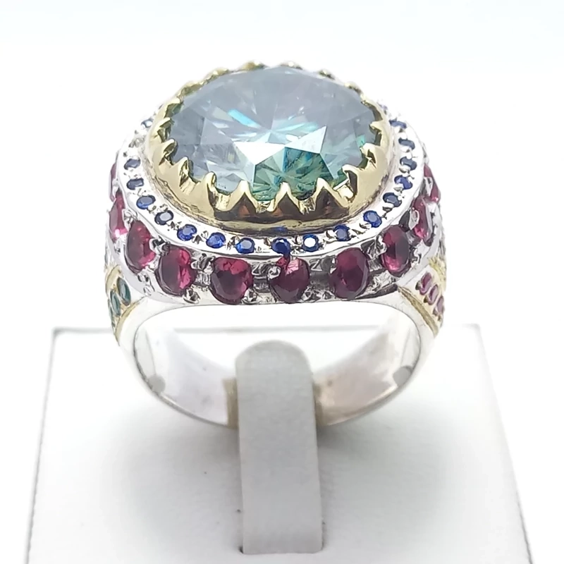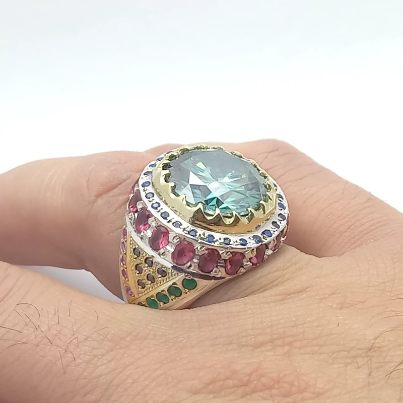 انگشتر نقره رکاب دست ساز مردانه همراه با موزانایت سبز 1