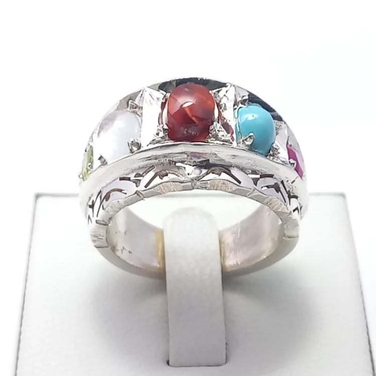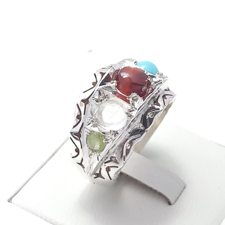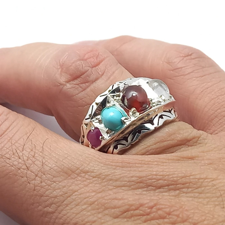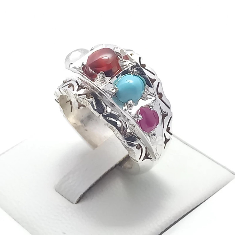 انگشتر نقره رکاب دست ساز مردانه همراه با یاقوت سرخ، فیروزه نیشابوری، عقیق یمنی، در نجف، زبرجد