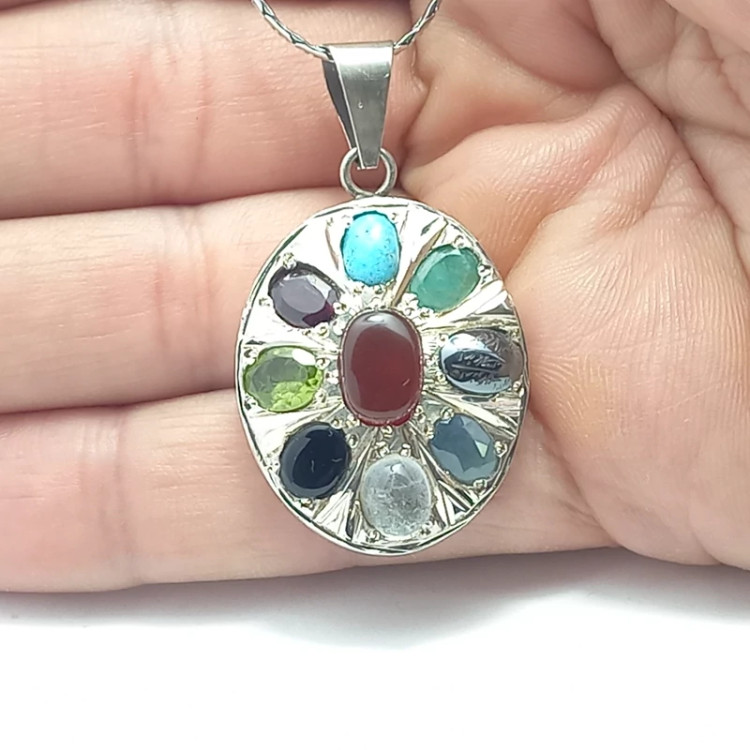 مدال نقره 9 جواهر ( عقیق یمنی، فیروزه نیشابوری، حدید، زمرد، در نجف، زبرحد، یاقوت کبود، یاقوت سرخ )