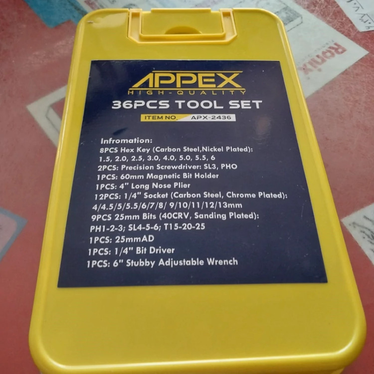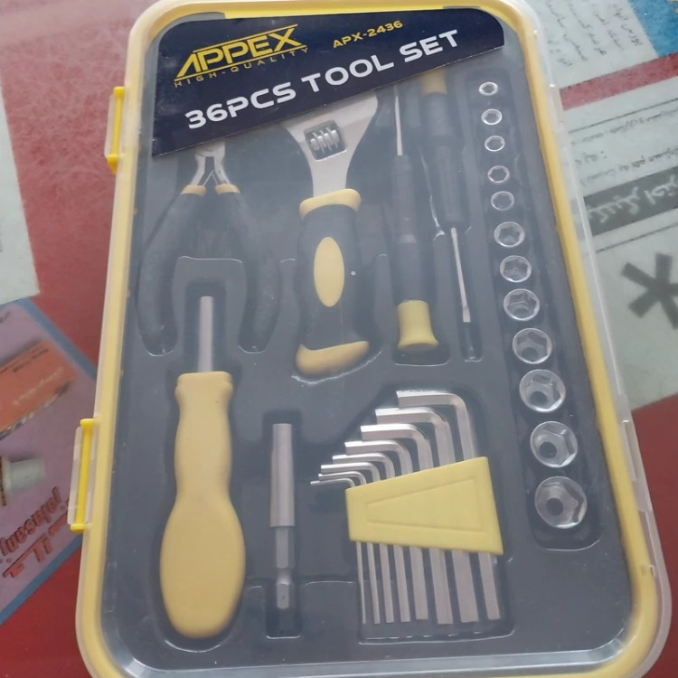 مجموعه 36 عددی ابزار شامل الن،دم باریک، بکس،فرانسه،رابط وبیت دوسو ،چارسو،الن وستاره ای وپیچ گوشتی دوسو وچارسو