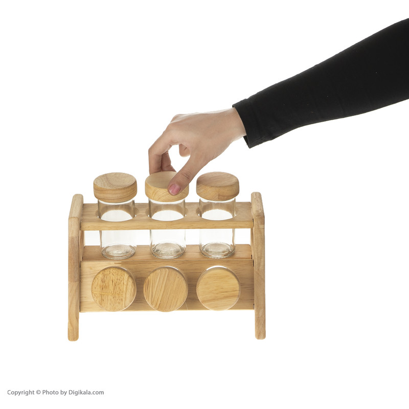 ساخته شده از چوب رابر دارای رنگ روشن و نقش و خلل و فرج طبیعی شامل 6 جا ادویه شیشه ای با درب چوبی هر یک به قطر 4 و ارتفاع 10 سانتیمر با خروجی ثابت استند با دسترسی آسان به جا ادویه ای ها شیک و ساده دارای جعبه ساخت کشور ایران