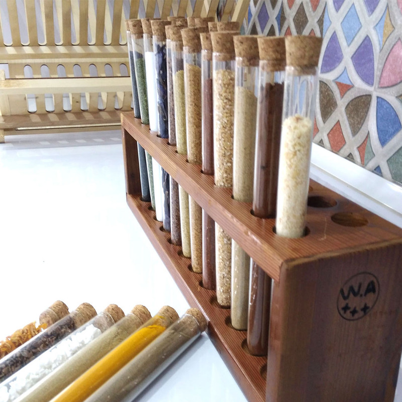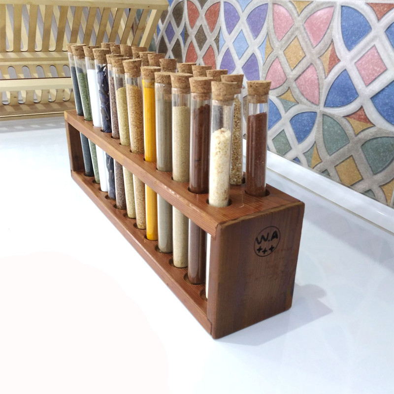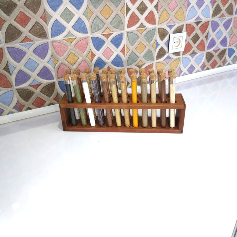 شامل یک عدد پایه از جنس چوب ترموی فنلاندی 24 عدد بطری شیشه ای هر کدام با حجم 60 میلی لیتر 24 درپوش از جنس چوب پنبه