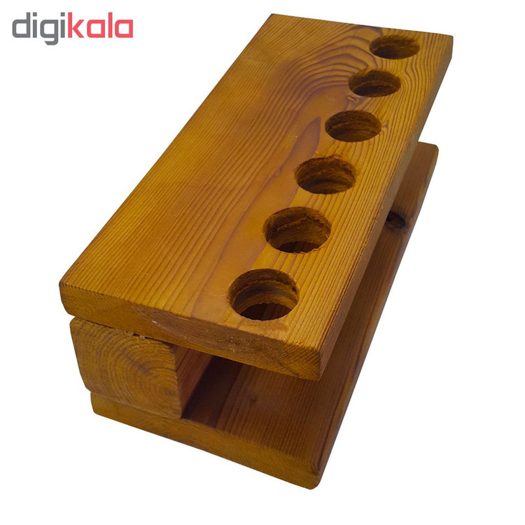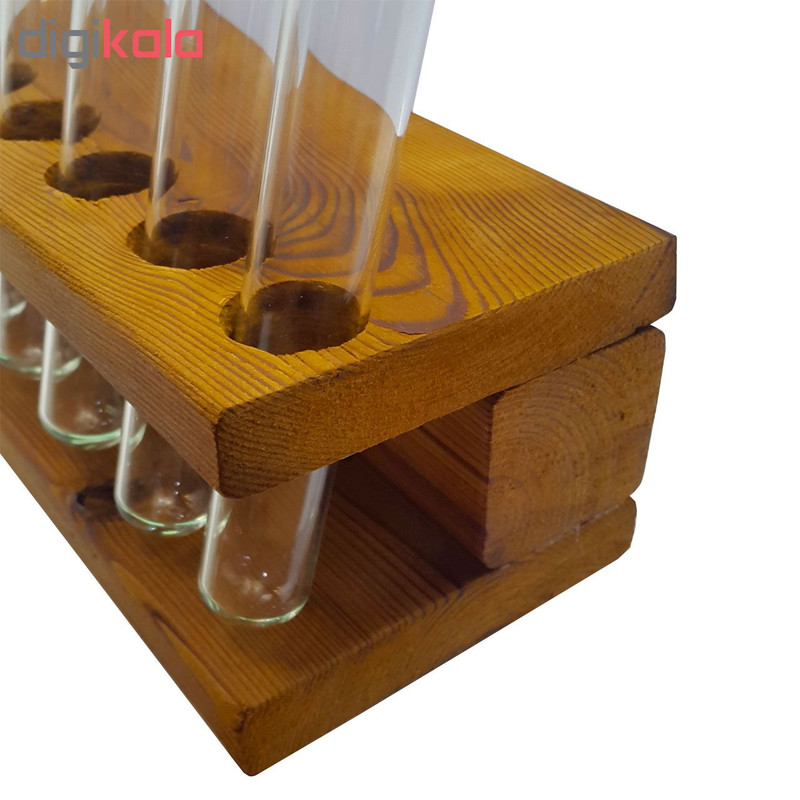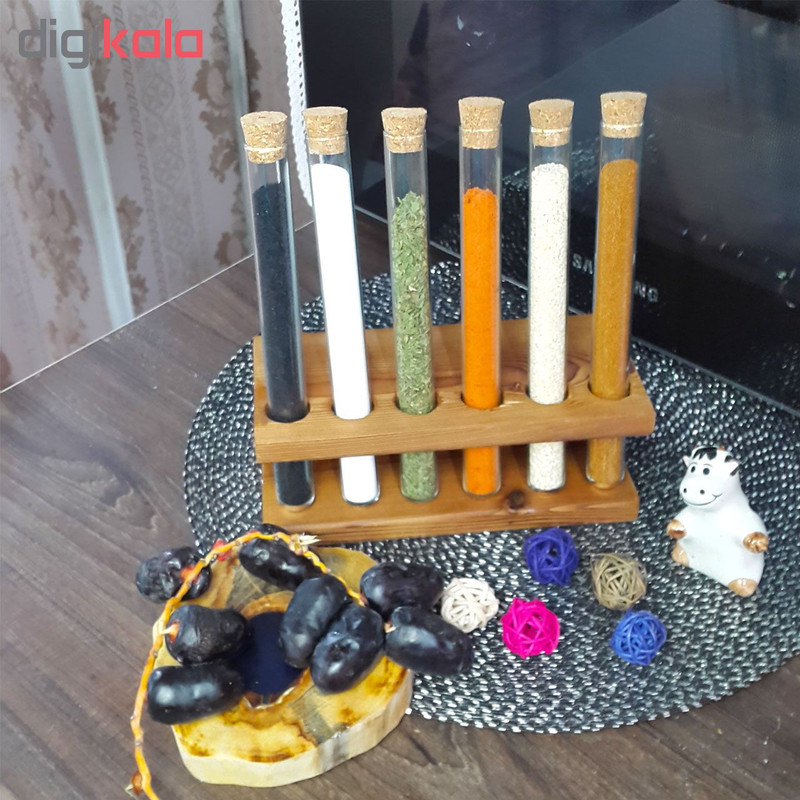 شامل یک عدد پایه از جنس چوب ترموی فنلاندی شش عدد بطری شیشه ای هر کدام با حجم 60 میلی لیتر شش درپوش از جنس چوب پنبه