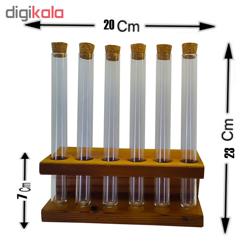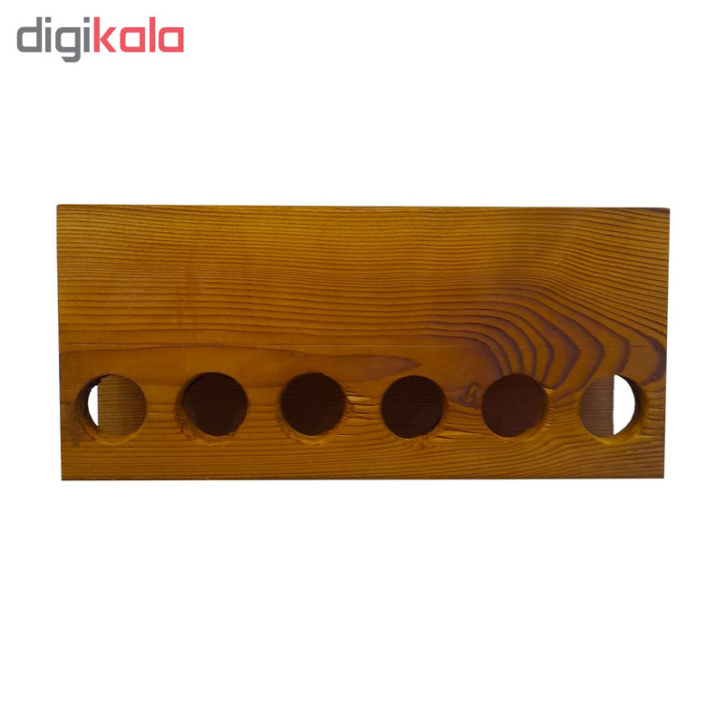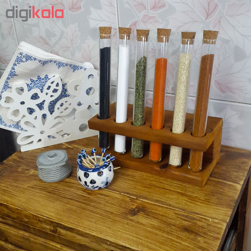 شامل یک عدد پایه از جنس چوب ترموی فنلاندی شش عدد بطری شیشه ای هر کدام با حجم 60 میلی لیتر شش درپوش از جنس چوب پنبه