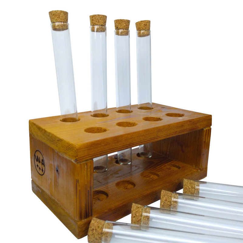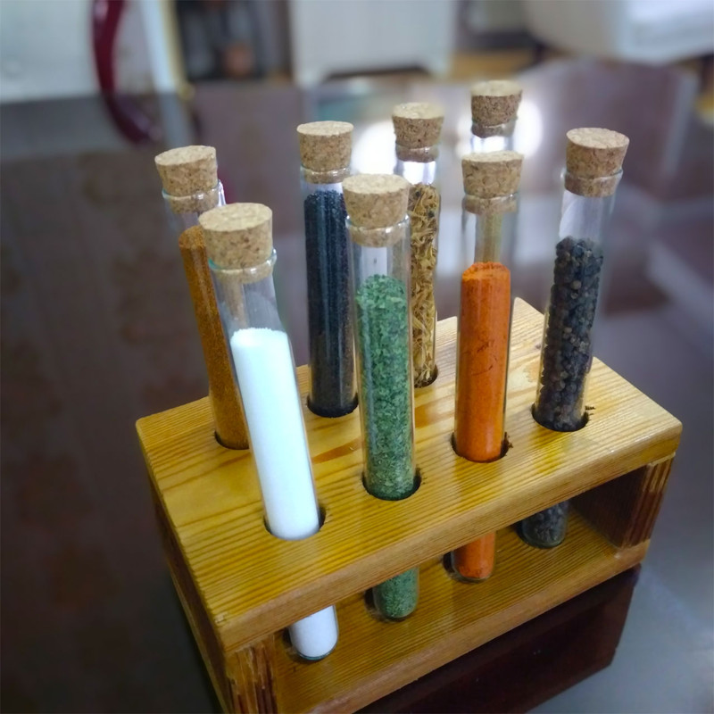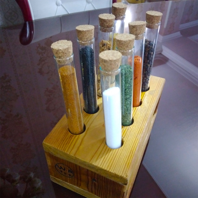 شامل یک عدد پایه از جنس چوب روسی هشت عدد بطری شیشه ای هر کدام با حجم 60 میلی لیتر هشت درپوش از جنس چوب پنبه