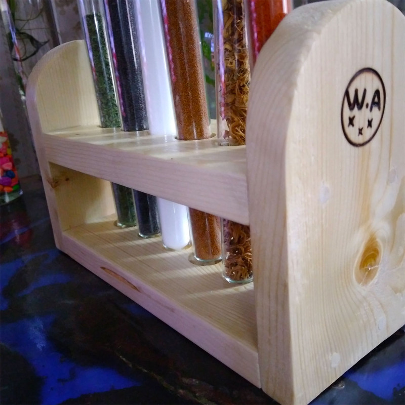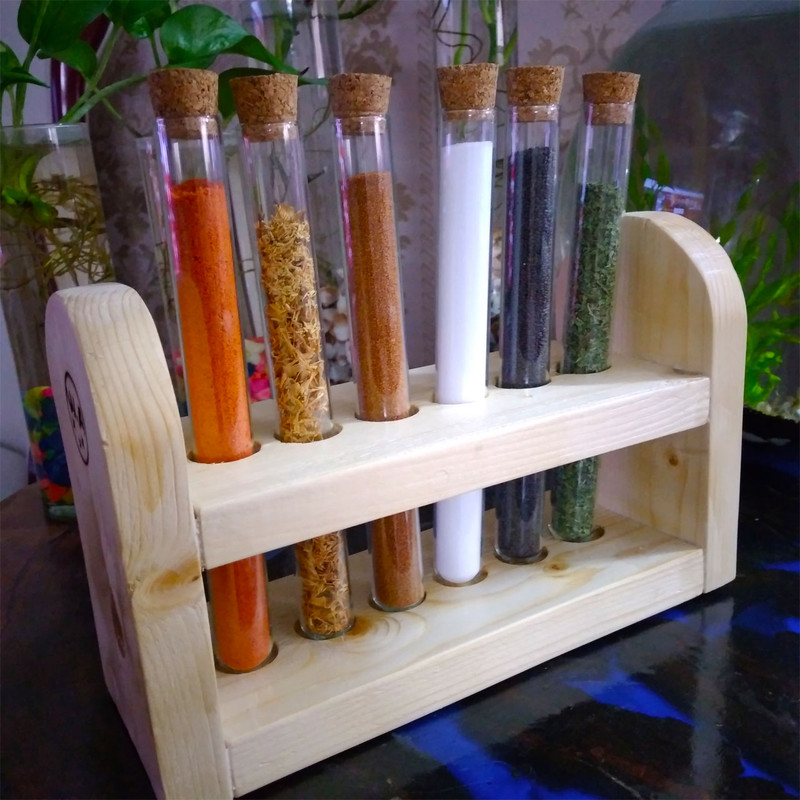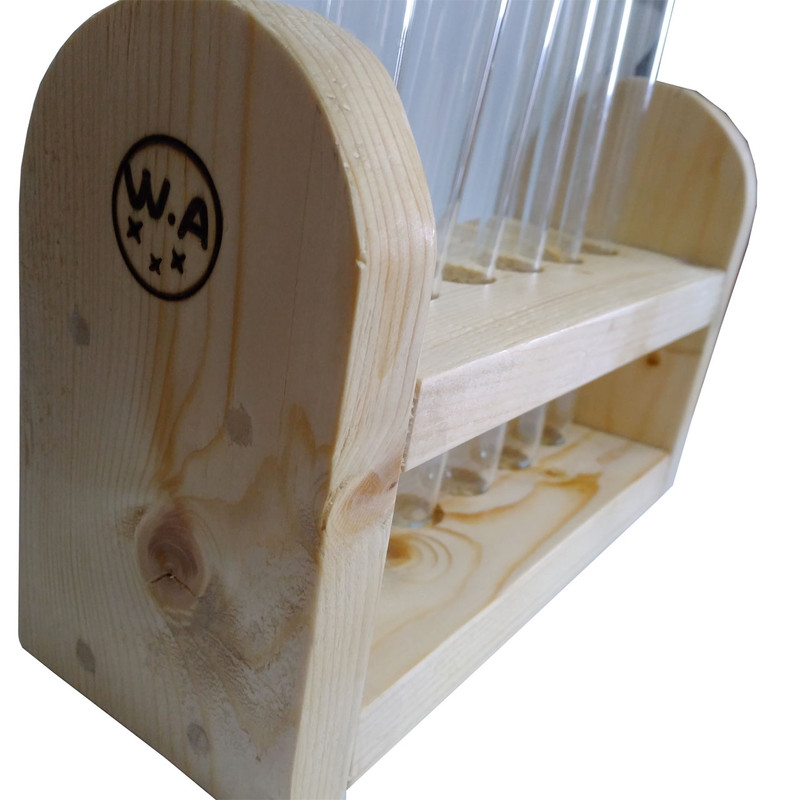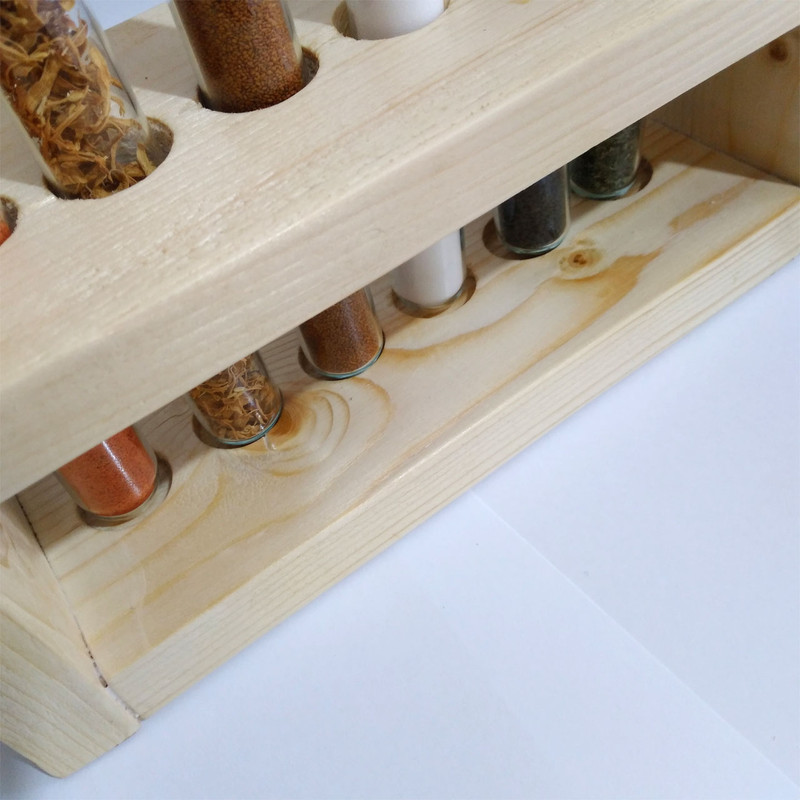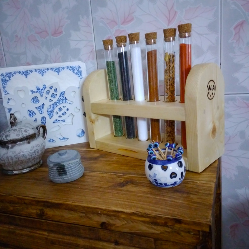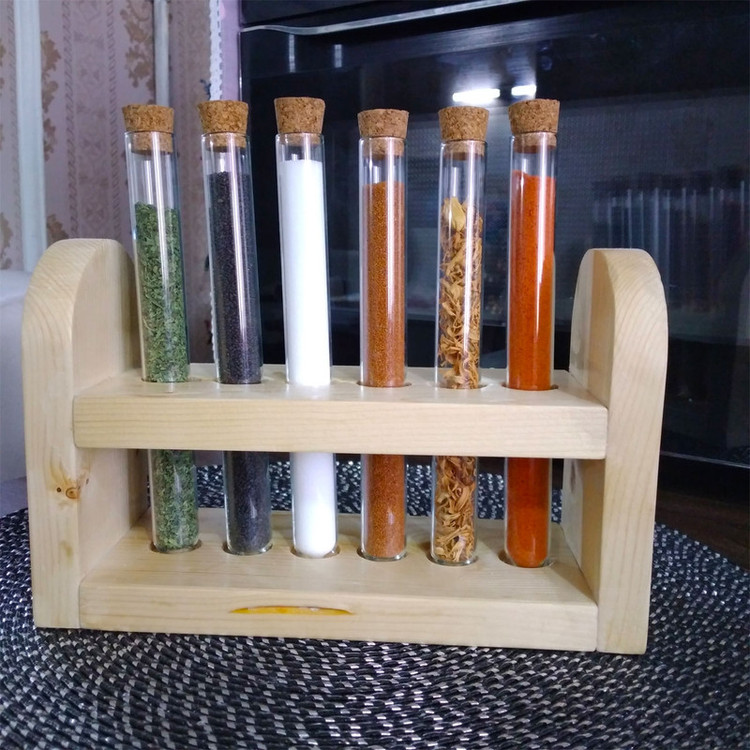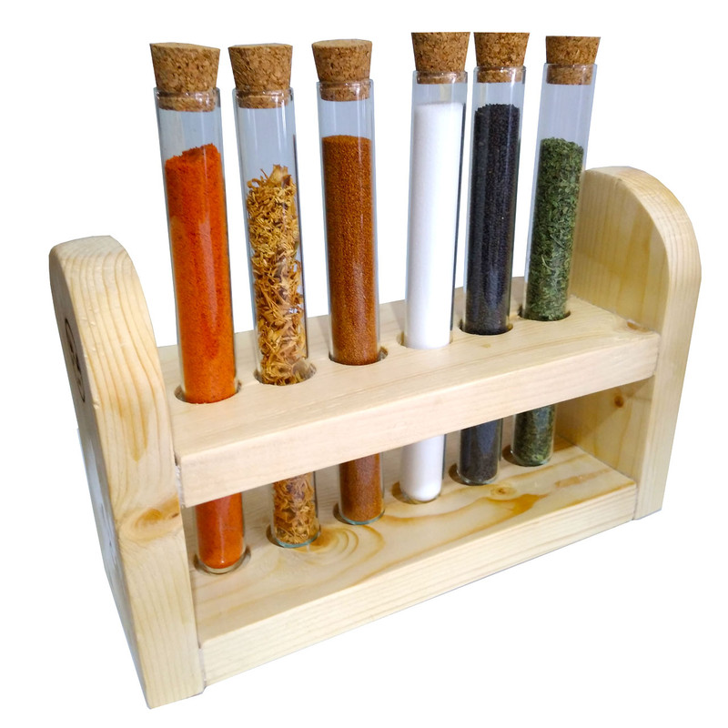 شامل یک عدد پایه از جنس چوب روسی شش عدد بطری شیشه ای هر کدام با حجم 60 میلی لیتر شش درپوش از جنس چوب پنبه