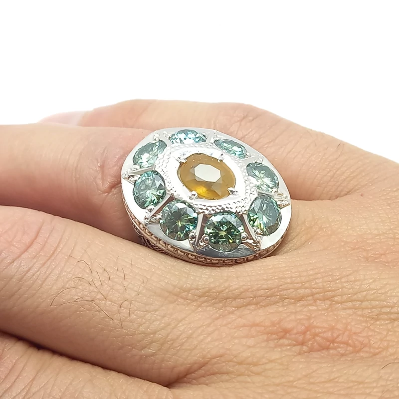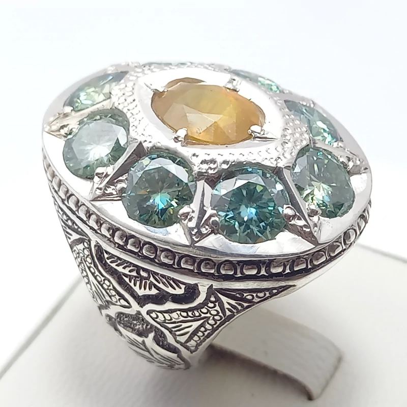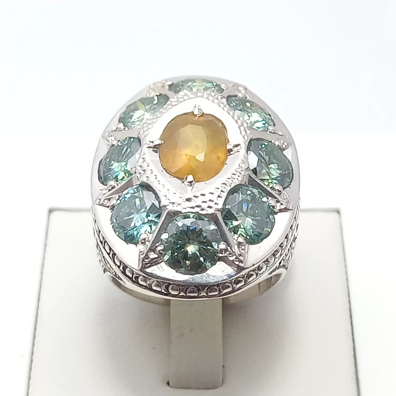 انگشتر نقره جواهری رکاب دست ساز مردانه همراه یاقوت زرد و موزانایت سبز