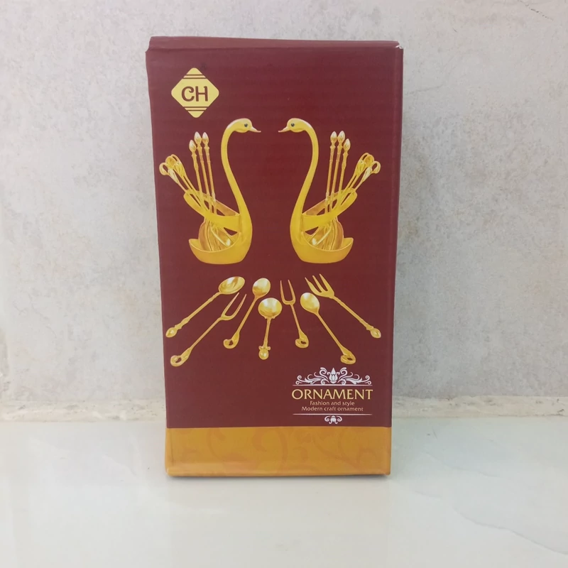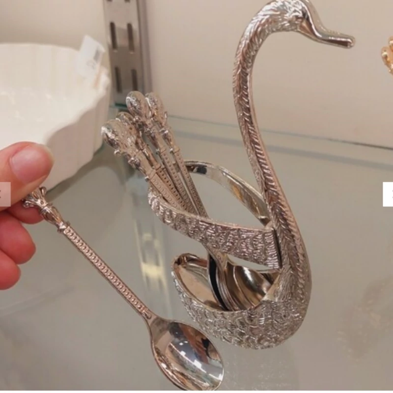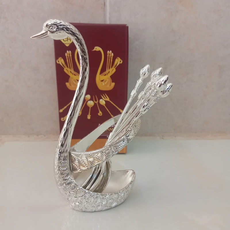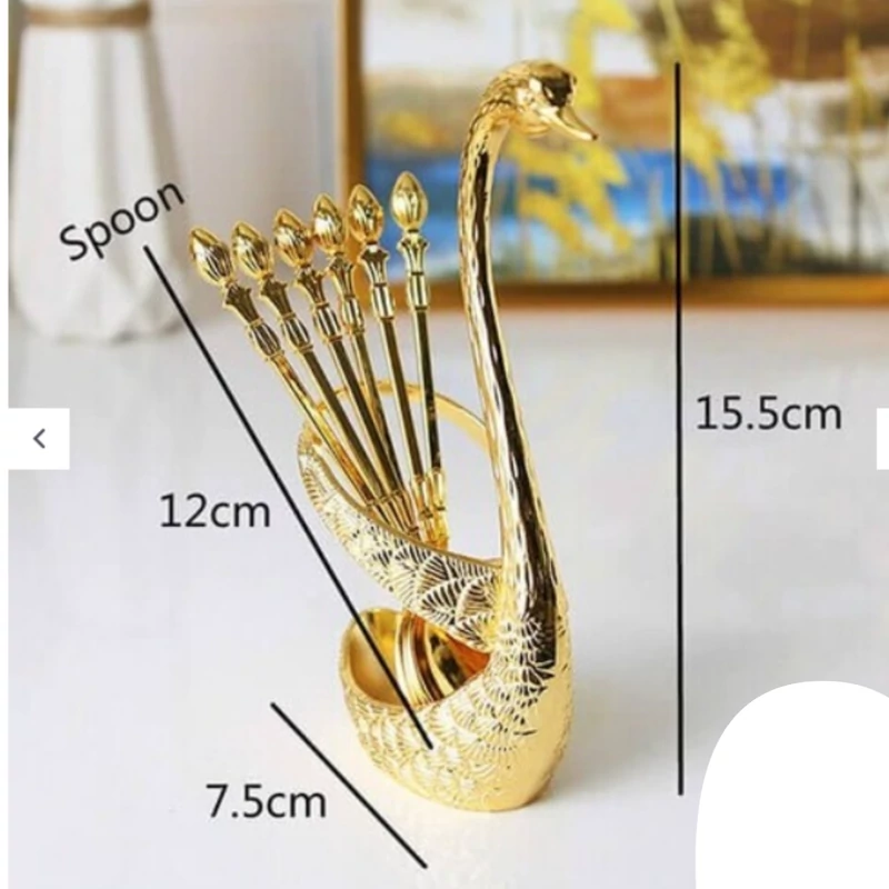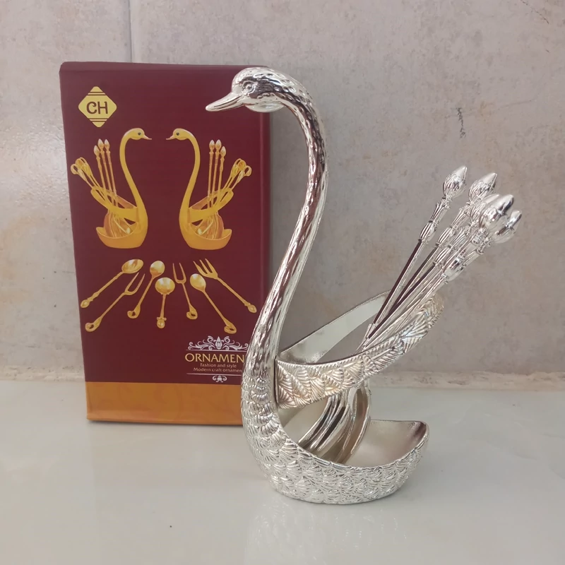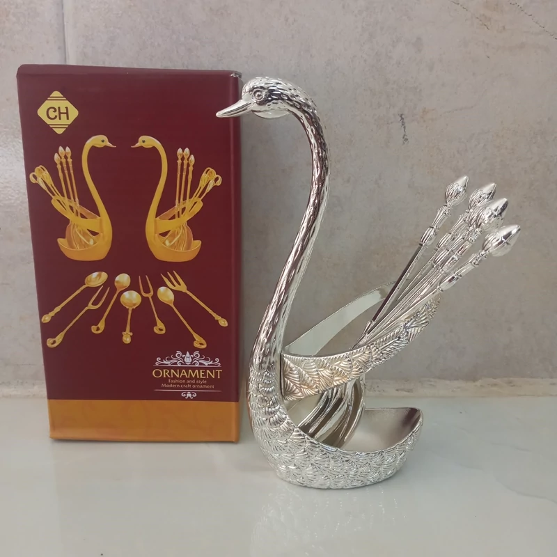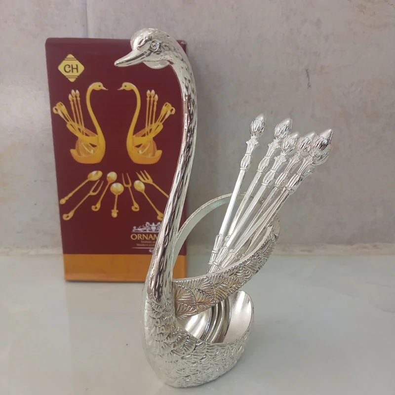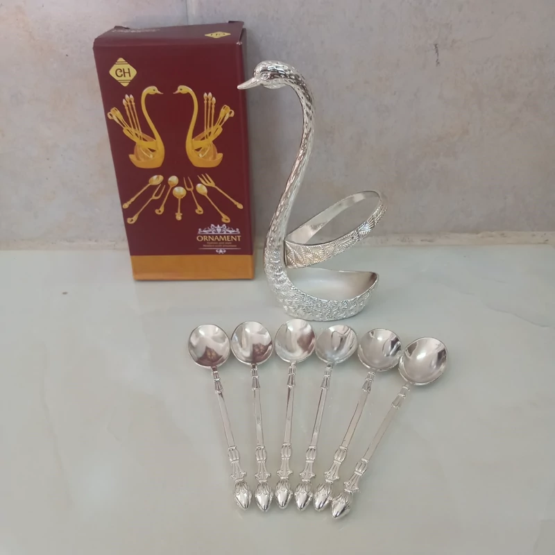 ست قاشق مدل قو شامل 6 عدد قاشق چای خوری پایه قو برای نگهداری از آن طراحی شده است . این محصول مناسب برای پذیرایی و در سینی سرو قرار میگیرد . این محصول از جنس برنج روکش شده میباشد، و مناسب برای دکوراتیو و استفاده برای پذیرایی است. طول هر قاشق حدود ۱۲.۵سانتی متر میباشد. سیلور موجود است