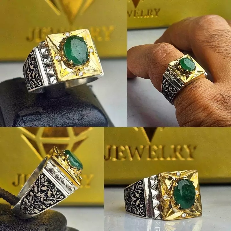 انگشتر مردانه زمرد اصلی زامبیا رکاب نقره چنگی دستساز ومخراج برلیان عیار925ارسال رایگان