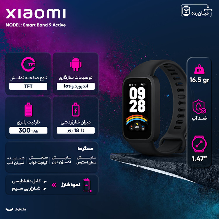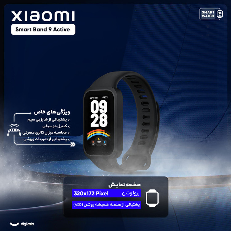 ساعت هوشمند 46 میلیمتری شیائومی مدل Smart Band 9 Active، کنترل موسیقی، کنترل سطح اکسیژن خون، شمارش ضربان قلب، پایش وضعیت خواب، با بند پلاستیکی