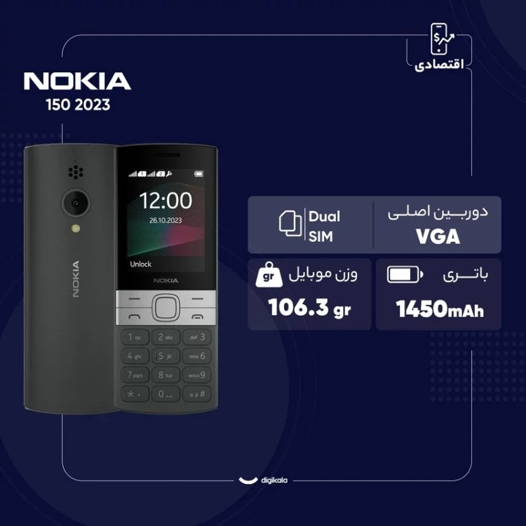 این موبایل نوکیا نیز مانند گوشی نوکیا 106 دو سیم کارت میخورد و میتوانید دو خط فعال به طور همزمان روی گوشی خود داشته باشید. حافظه داخلی گوشی نوکیا 150 2023 تنها 8 مگابایت است و 4 مگابایت نیز رم برای آن در نظر گرفته شده. البته، به کمک کارت حافظه MicroSD میتوانید حافظه گوشی را ارتقا دهید. دوربینی که در پشت گوشی قرار گرفته، چندان رضایت بخش نخواهد بود چرا که تنها 0.08 مگاپیکسل است و فقط در مواقعی که نیاز به عکاسی ضروری از چیزی دارید کارتان را راه میاندازد. دوربین گوشی همچنین امکان و اجازه فیلمبرداری را نیز به شما میدهد. این موبایل نوکیا از زبان فارسی در منو پشتیبانی میکند و شما میتوانید بهراحتی زبان گوشی را تغییر داده و استفاده کنید. دیگر مشخصه این گوشی، باتری آن است که 1450 میلی آمپر ساعت ظرفیت دارد. گوشیهای ساده نوکیا به باتری بادوامشان معروف هستند. خوب است بدانید که این گوشی نیز استثنا نیست و با یک بار شارژ کردن، میتوانید زمان زیادی از آن استفاده کنید
