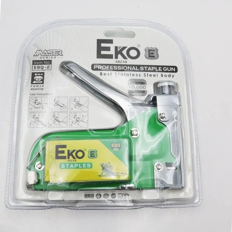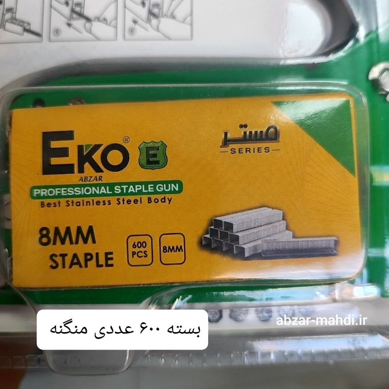 - منگنه کوب دستی اکو - دسته متحرک فلزی و بدنه کاملا فلزی و مقاوم - سایز سوزن مورد استفاده : طول 14 میلیمترو ارتفاع پایه سوزن : 4 . 10 . 12 میلیمتر با این منگه کوب قابل استفاده می باشد - مناسب دو سایز منگنه 10-12 و 4-14 میلیمتر و همچنین مناسب میخ منگنه 10-14 میلیمتر می باشد - دارای پیچ تنظیم فشار و قدرت کوبش در کارهای مختلف - همراه بسته 600 عددی منگنه - وزن: 500گرم