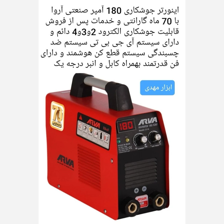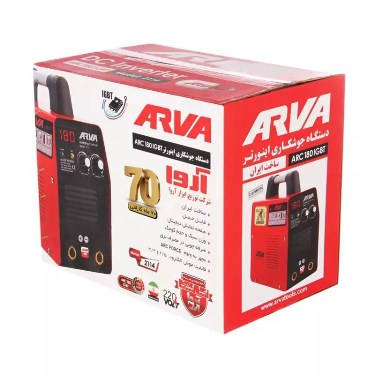 اینورتر جوشکاری 180 آمپر آروا مدل 2114 با 70 ماه گارانتی و ارسال رایگان به همراه کابل و انبر جوش و اتصال درجه یک