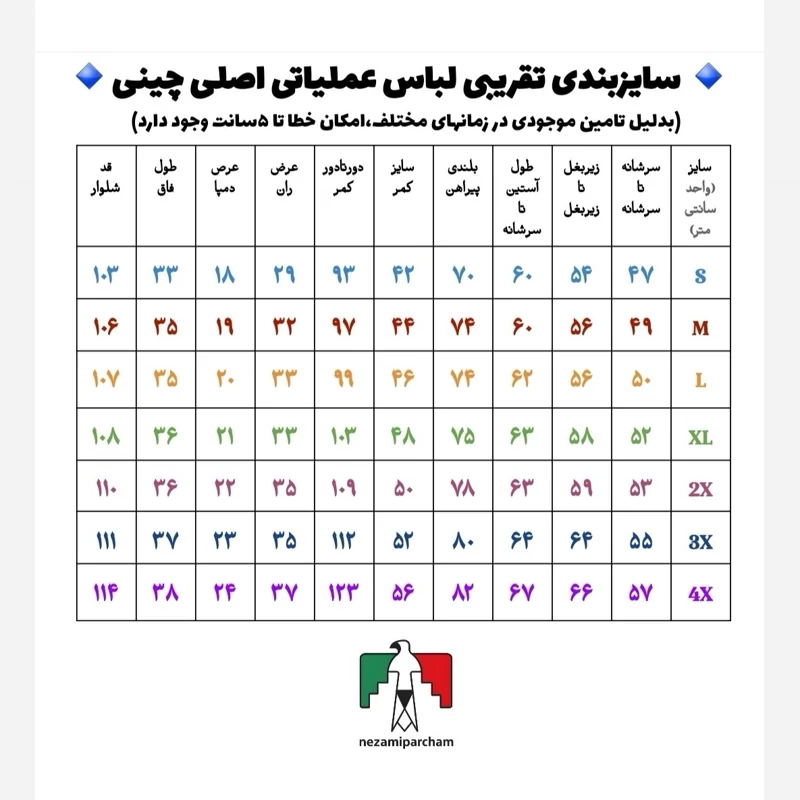 - جدول سایز تقریبی میباشد و بدلیل تولید کالا در زمانهای مختلف امکان خطا تا 10 سانت وجود دارد.