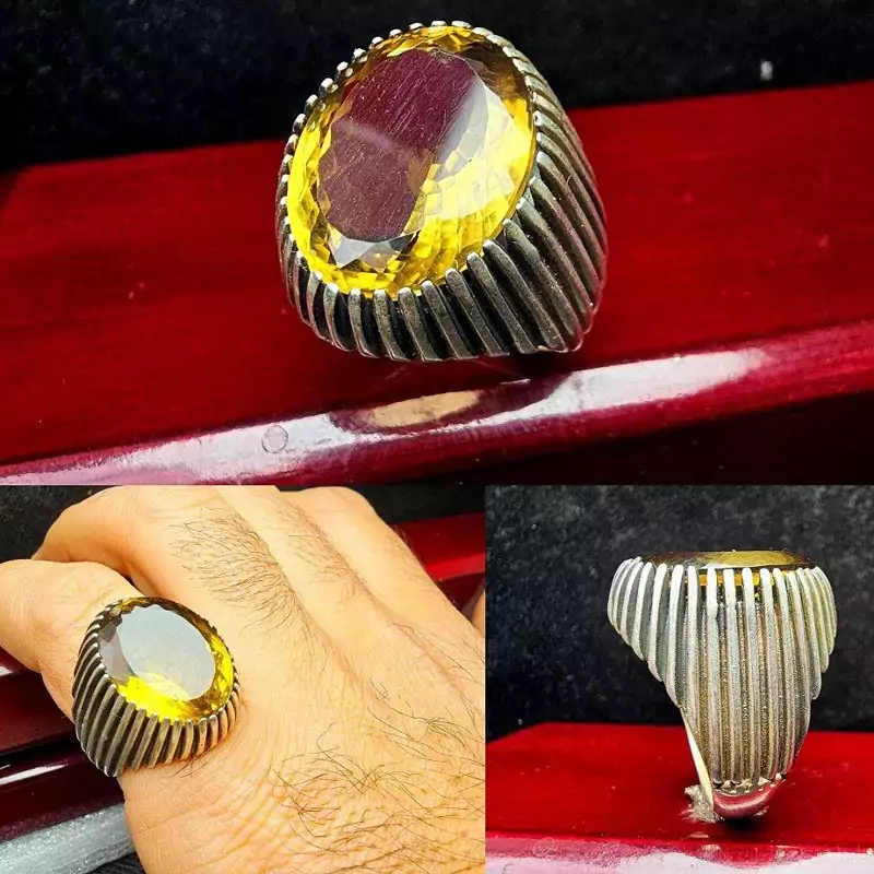 انگشتر مردانه سیترین طلایی اصلی درشت رکاب نقره چنگی خط راست عیار925ارسال رایگان سایزرایگان