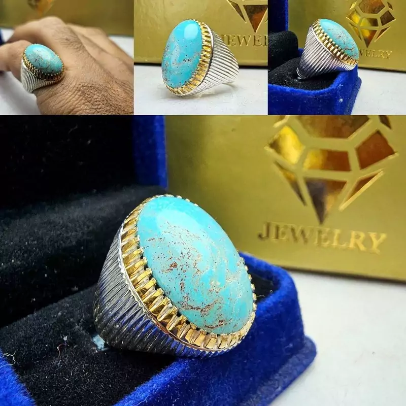 انگشتر مردانه فیروزه درشت نیشابوراصل رکاب نقره چنگی دستساز خط راست عیار925ارسال رایگان سایزرایگان