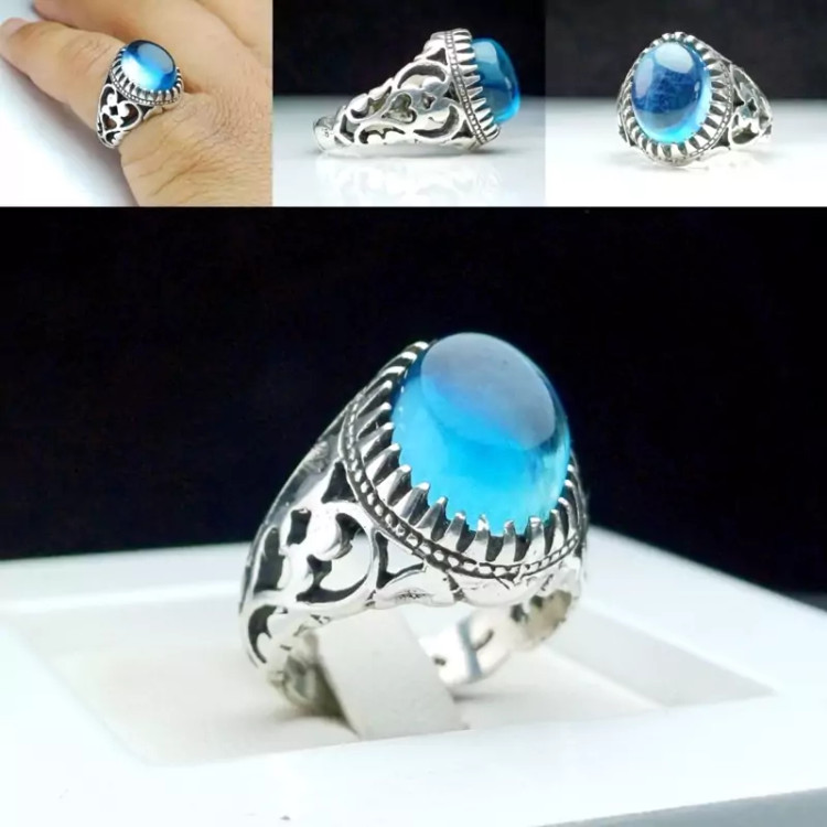 انگشتر مردانه آکومارین اصلی رکاب نقره چنگی طرح سیاه قلم عیار925ارسال رایگان سایزرایگان