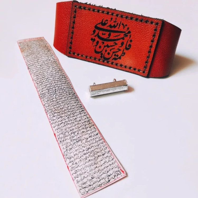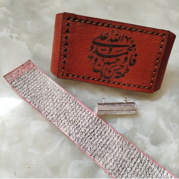 پک کامل حرز امام جواد ع دست نویس روی پوست طبیعی با رعایت آداب و بازوبند چرم و استوانه نقره با حکاکی حرز