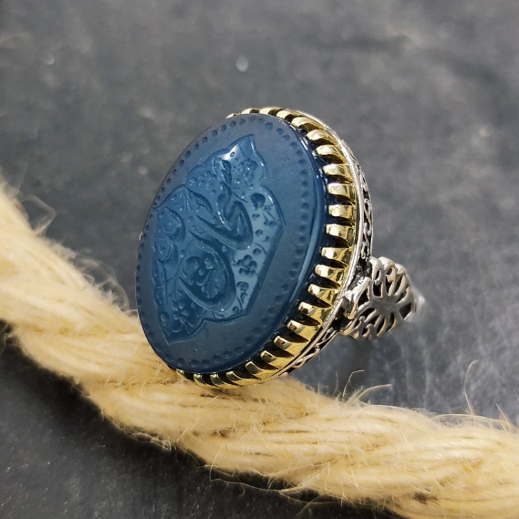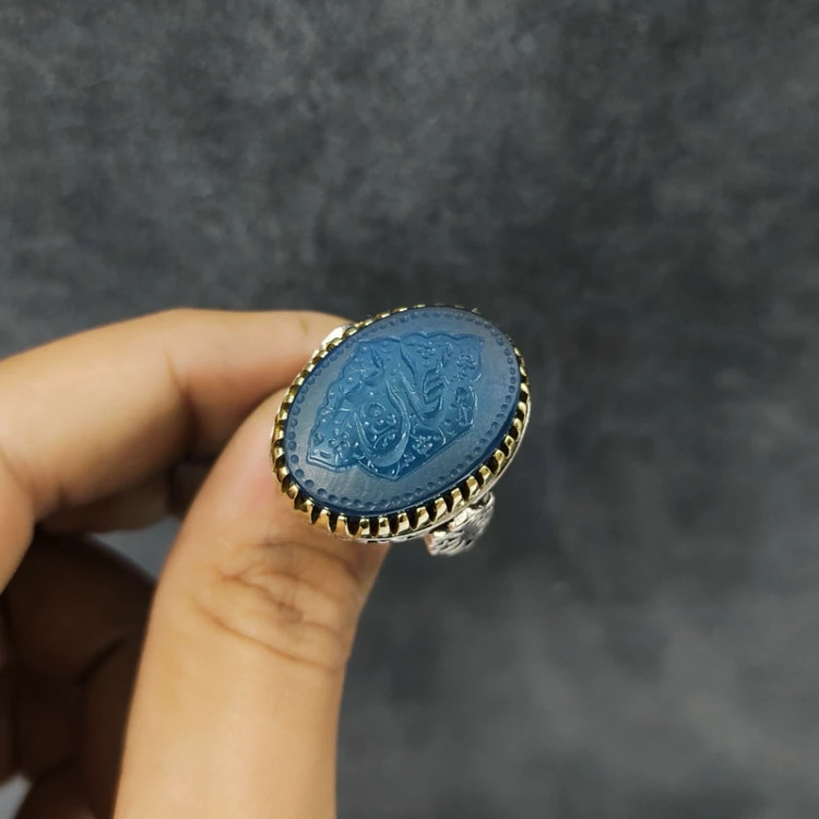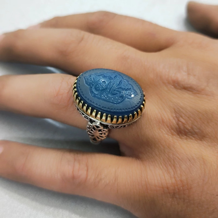 انگشتر عقیق آبی نقره مردانه طرح “سبحان الله” با نقره 925 عیار ساخته شده است. سطح صیقلی و کاملا صاف و یکنواخت این محصول علاوه بر درخشش و ایحاد جلوه بینظیر، این انگشتر را به یک اثر هنری تبدیل کرده است و ساخت رکاب با ظرافت و تمیزی بالا انجام شده است. روی نگین حکاکی دست نویس سبحان الله به صورت هنری و با کیفیت خوب انجام شده است که زیبایی محصول را چند برابر کرده است.