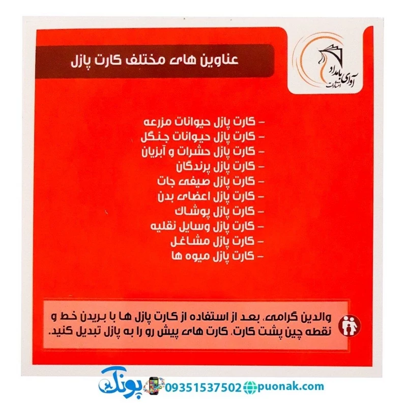 با جدا سازی آن میتوان هر کارت را به یک پازل 2 یا 4 بخشی تقسیم کردو مهارت چیدمان پازل را به کودک آموزش داد.