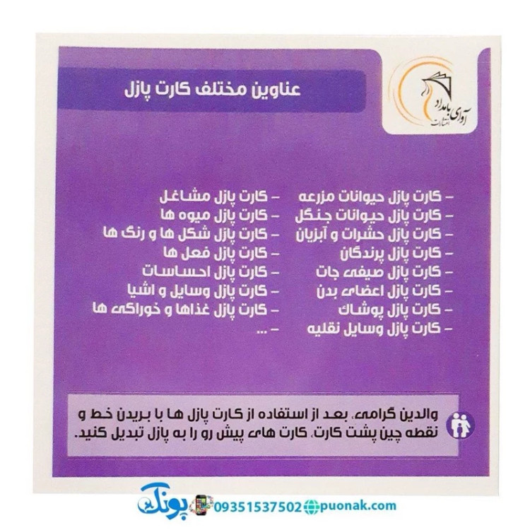 با جدا سازی آن میتوان هر کارت را به یک پازل 2 یا 4 بخشی تقسیم کردو مهارت چیدمان پازل را به کودک آموزش داد.